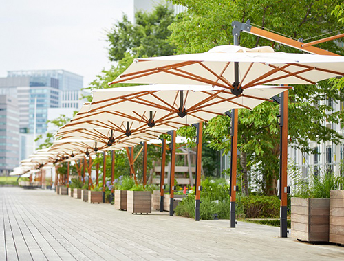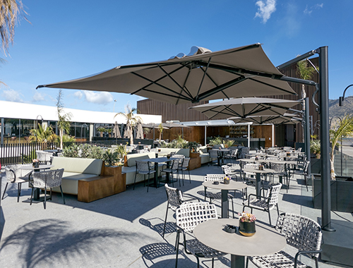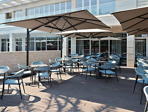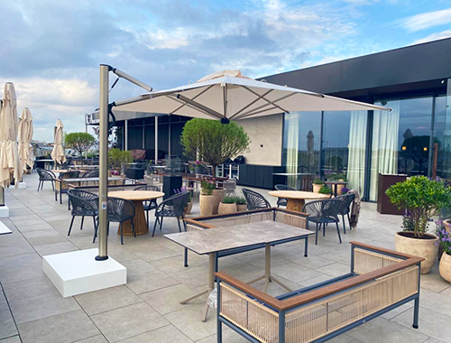 Квадратная модель в современном исполнении идеальна для небольших террас и городских заведений. Как и Astro Carbon, она работает на газовом поршне, открывается и закрывается одним движением, не требуя освобождения зоны под куполом. Цветовая пара титан + слоновая кость подчеркнёт лаконичный дизайн любого интерьера в стиле минимализм. Несмотря на компактные габариты, зонт сохраняет все преимущества профессиональной серии: прочный алюминиевый каркас, акриловый тень и устойчивость к ветру до 10 м/с.