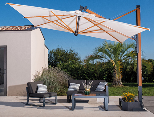 Модель сочетает проверенные решения и эстетику: декоративное покрытие под дерево (имитация ироко) придаёт зонту благородный, респектабельный вид. Открытие осуществляется с помощью ручной лебёдки, а выдвижная система позволяет закрывать зонт, не передвигая мебель. Galileo Wood также оснащён ветровой блокировкой, вентиляционным клапаном и системой быстрой замены спиц - всё для долгой и надёжной службы.