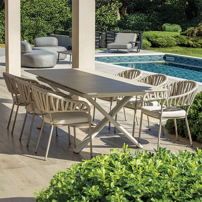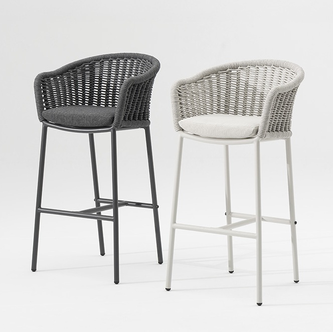 Коллекция Lecce - легкие и эргономичные обеденные и барные кресла с обволакивающей спинкой, плетеной из акрилового каната. Съемная подушка из олефина устойчива к внешним воздействиям, а функция штабелирования позволяет легко менять конфигурацию пространства. Свежий взгляд на комфорт как в помещении, так и на воздухе.