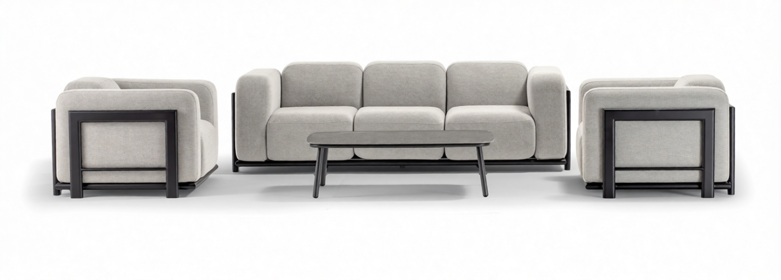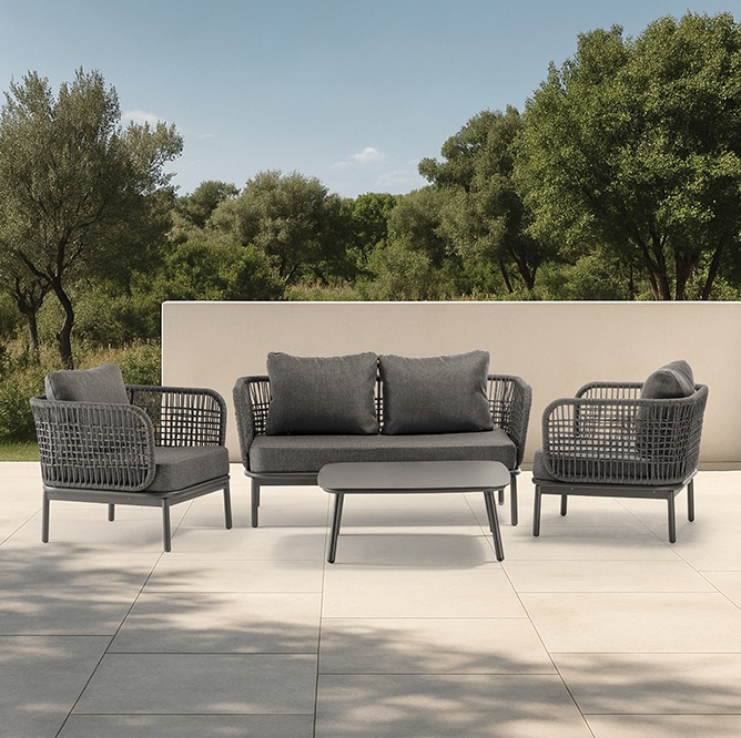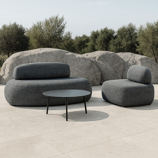 Комплект Rock - лаконичный и брутальный набор для отдыха. Прочный алюминиевый каркас с резиновым покрытием надежно защищен от непогоды, а глубокие подушки из олефина с водонепроницаемым покрытием созданы для максимального расслабления и простоты ухода. Включает кресло, диван и столик.