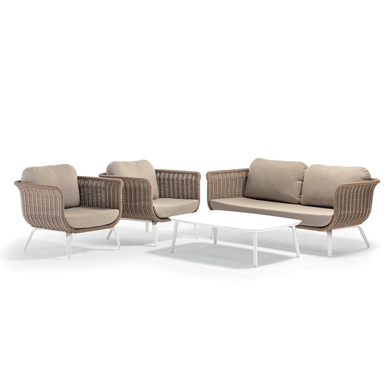 Комплект Yolk - ансамбль для полноценного отдыха, состоящий из дивана, двух кресел и столика с алюминиевой столешницей. Выразительная текстура плетения из роупа диаметром 6 мм задает тон, а мягкие подушки на быстросохнущей основе гарантируют комфорт. Стильное решение для открытых гостиных.