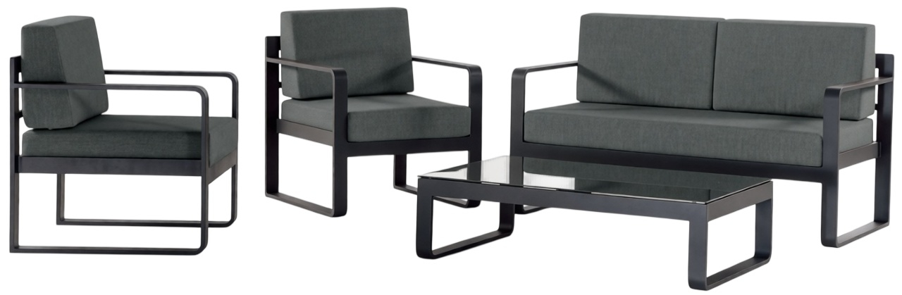 Комплект Capri состоит из дивана, двух кресел и журнального столика. Каркас мебели выполнен из алюминия с порошковым покрытием, подушки на диване и креслах - из стойкого к истиранию и ультрафиолетовому излучению олефина, столешница журнального столика - из стекла. Такой комплект украсит лаунж-зону возле бассейна или на террасе загородного дома.