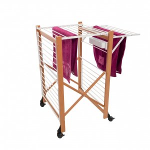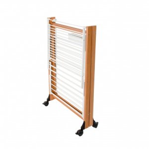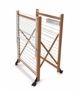 Каркас изделия изготовлен из высококачественного массива бука, а рамки и прутья - из лёгкого алюминия со специальным порошковым покрытием. Встроенные колёсики с функцией анти-след делают сушилку очень мобильной, но при этом не портят покрытие пола.