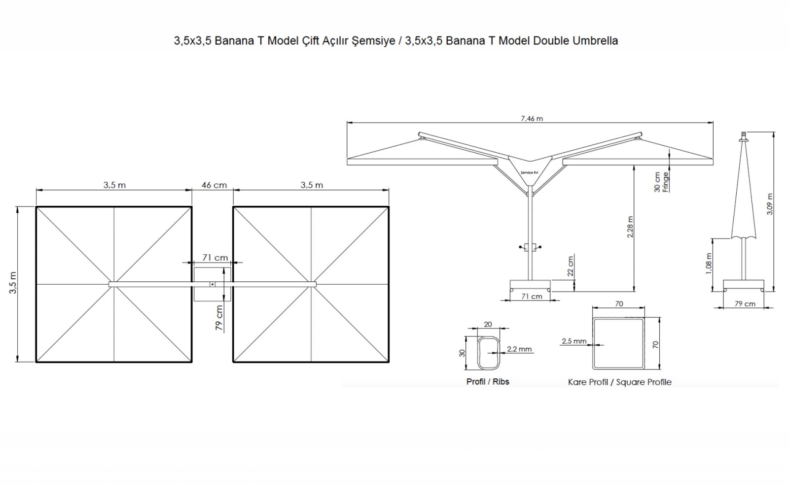 Double Banana - единая база, но больше затенения. Одна опора и два зонта, открывающиеся по бокам, обеспечивают затененную уютную атмосферу на любых открытых площадках. Алюминиевая конструкция, европейская ткань и утяжелительная база гарантируют простое использование.