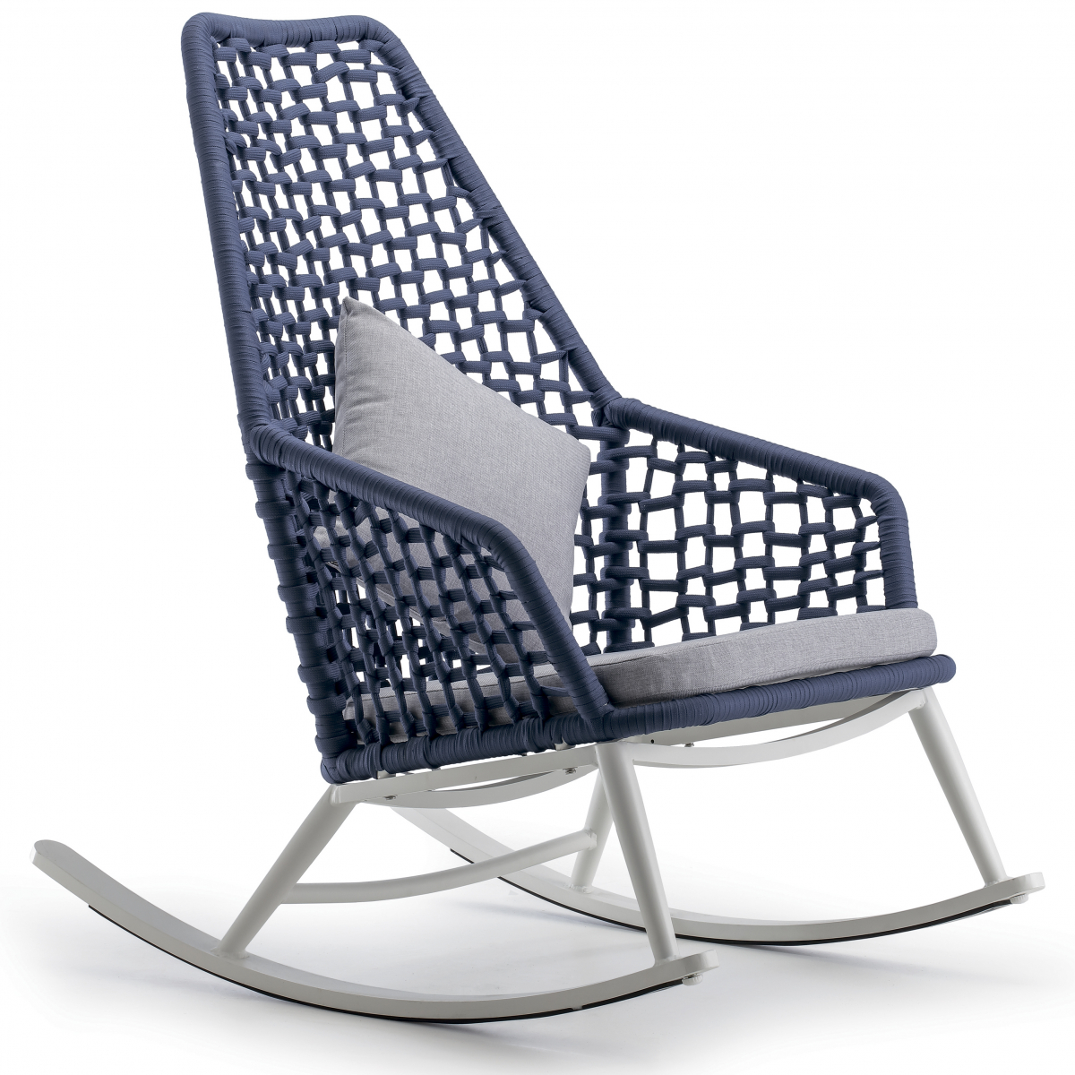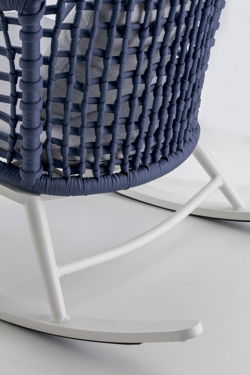 Элегантное кресло-качалка Kos для отдыха на террасе или в саду. Каркас этого кресла выполнен из окрашенного в белый цвет алюминия и дополнена красивым переплетением из полиэстерового каната, которая создает спинку и подлокотники. На сиденье подушка идеальной формы, выполненная из быстросохнущего поролона с чехлом из олефина, идеально подходящая для наружного применения. Кресло-качалка является отличным решением для обустройства открытых пространств частных домомй, а также для клубов или отелей, где его гости будут сидеть и качаться во время ожидания или отдыха.