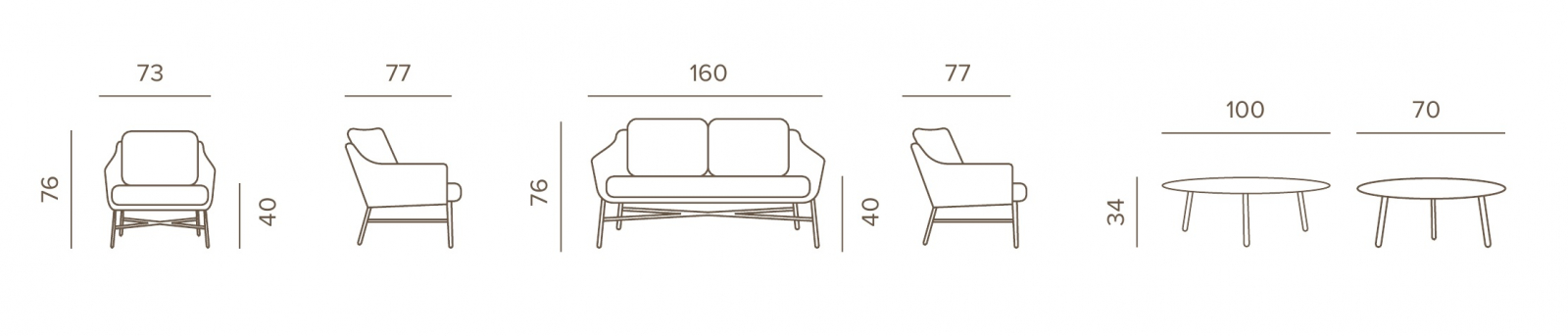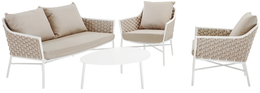 Комплект Panama состоит из двухместного дивана, двух кресел и журнального столика. Устойчивый и надежный каркас из алюминия кресел и дивана оплетен текстиленовым и резиновым канатом. Подушки из текстилена обеспечивают дополнительный комфорт. Журнальный столик выполнен из алюминия. Стильный и удобный комплект можно разместить в зоне отдыха в помещении или на открытом воздухе.