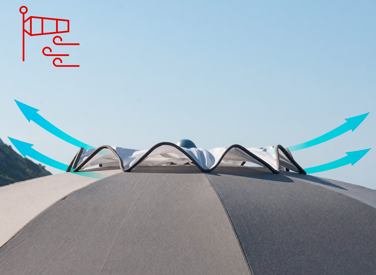 Клапан устанавливается на зонты в случае, если пляжный курорт находится в чрезвычайно ветренном месте, либо с декоративной целью. Подходит для всех зонтов Magnani, кроме Matisse и Picasso, т.к. у них уже установлен. Выполняется из той же ткани, что и купол зонта. Внутри отделан прозрачным пластиком, чтобы сделать изгиб более жестким.