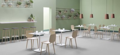 Столешницы из листовой стали толщиной 12 мм с плоской кромкой долговечны и универсальны. Фабрика Pedrali предлагает широкий выбор цветов, которые будут отлично сочетаться с подстольями такого же цвета.