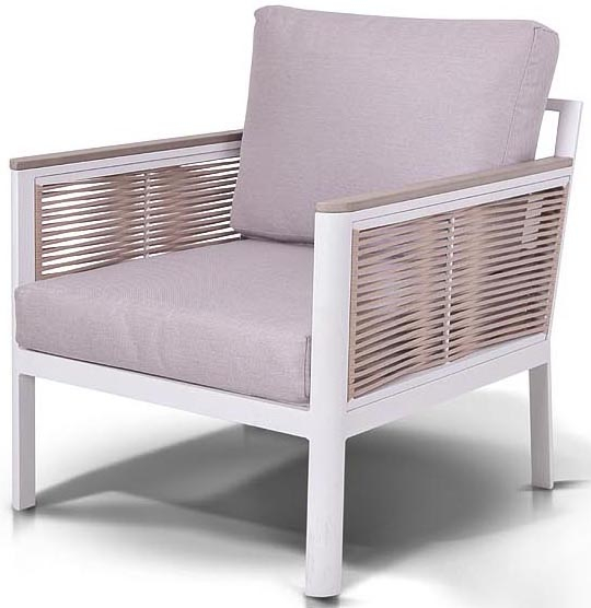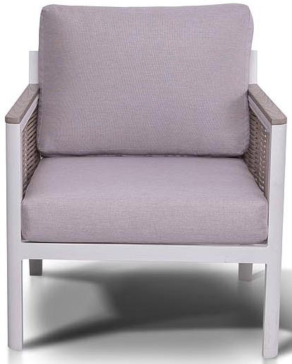 Высокопрочный и легкий алюминиевый каркас белого цвета кресла Сан Ремо выдерживает нагрузки до 200 кг. На подлокотниках круглое плетение каната, подушки со съемными чехлами серого цвета выполнены из водостойкой полиэфирной ткани для защиты мебели от дождя и солнца. Подлокотники со вставками имитации дерева, алюминиевое основание ножек. Стильное кресло в минималистичном дизайне подойдет для частных и коммерческих интерьеров и открытых пространств.