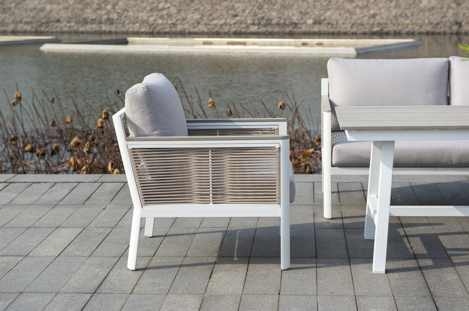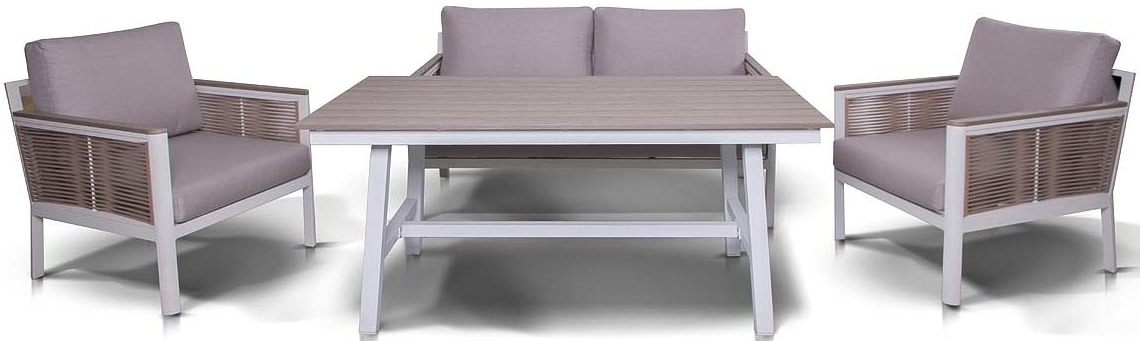 Комплект Сан Ремо имеет высокопрочный и легкий алюминиевый каркас белого цвета, который выдерживает нагрузку до 200 кг. На креслах и диване подлокотники со вставками имитации дерева. Подушки выполнены из водостойкой полиэфирной ткани для защиты мебели от дождя и солнца, съемные чехлы серого цвета. Столешница стола выполнена из полимера с текстурой под дерево. Данный комплект подходит для использования внутри помещения и на открытом воздухе
