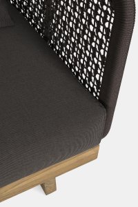 Сиденье и ножки выполнены из тика SVLK (легальное индонезийское дерево) с отделкой рустик. Каркас выполнен из алюминия с порошковой покраской (полиэстер), спинка и подлокотники оплетены полипропиленовым канатом, водоотталкивающим и устойчивым к ультрафиолету. Подушки с наполнителем из быстросохнущей пены (от влажности) и съемным чехлом из ткани sunbrella (100% акрил).