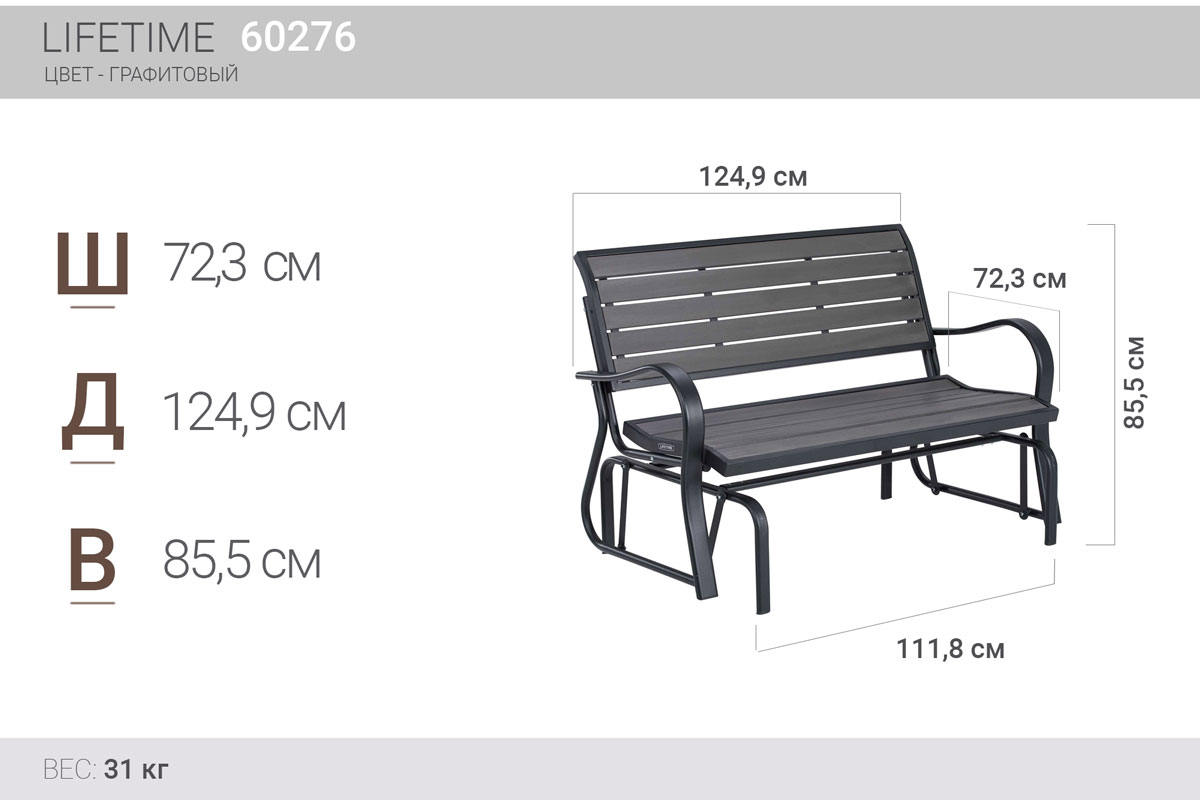 Комфортная скамья-качалка LIFETIME украсит любую территорию загородного дома, сада или парка. Внешний вид скамейки на 100% имитирует дерево, как на ощупь, так и внешний вид. Данная лавочка может использоваться для коммерческих целей!