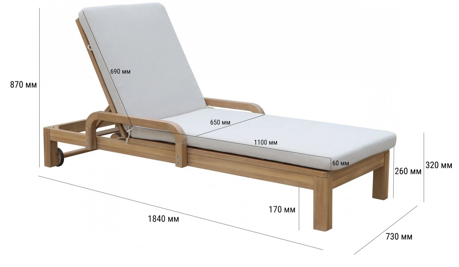 Шезлонг деревянный с матрасом Condao Tagliamento, Вьетнам, 2000х705х435 мм