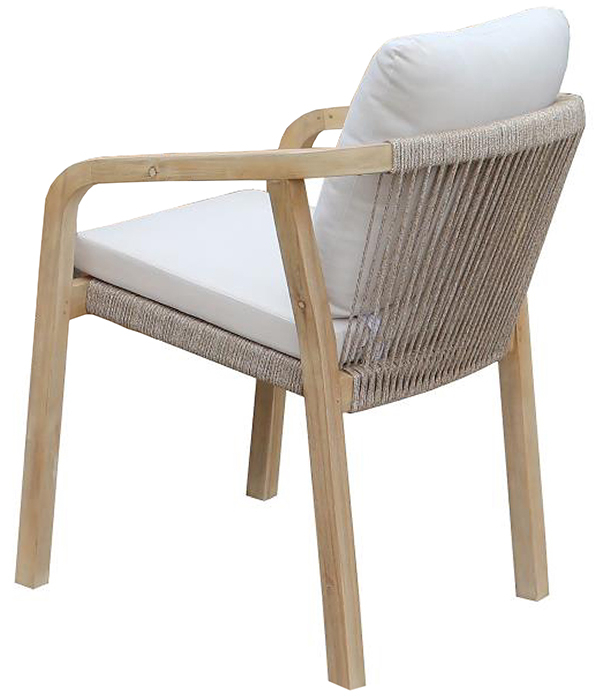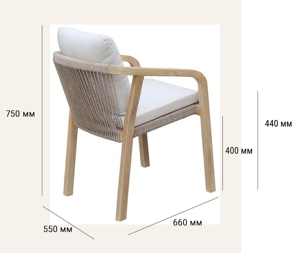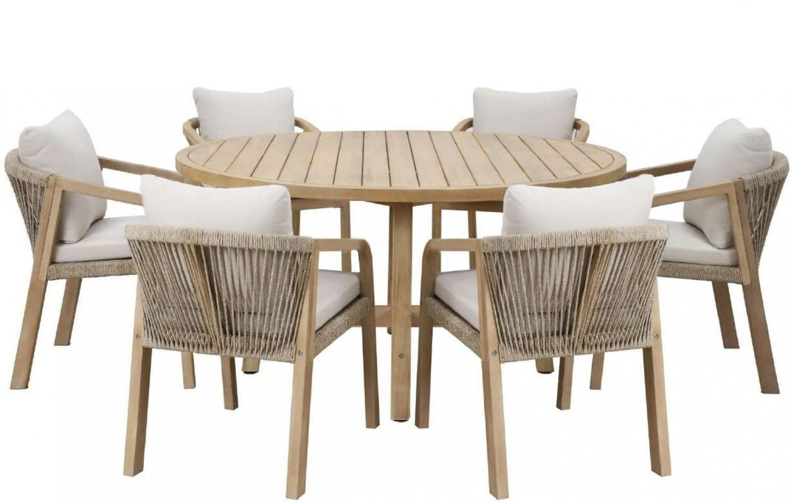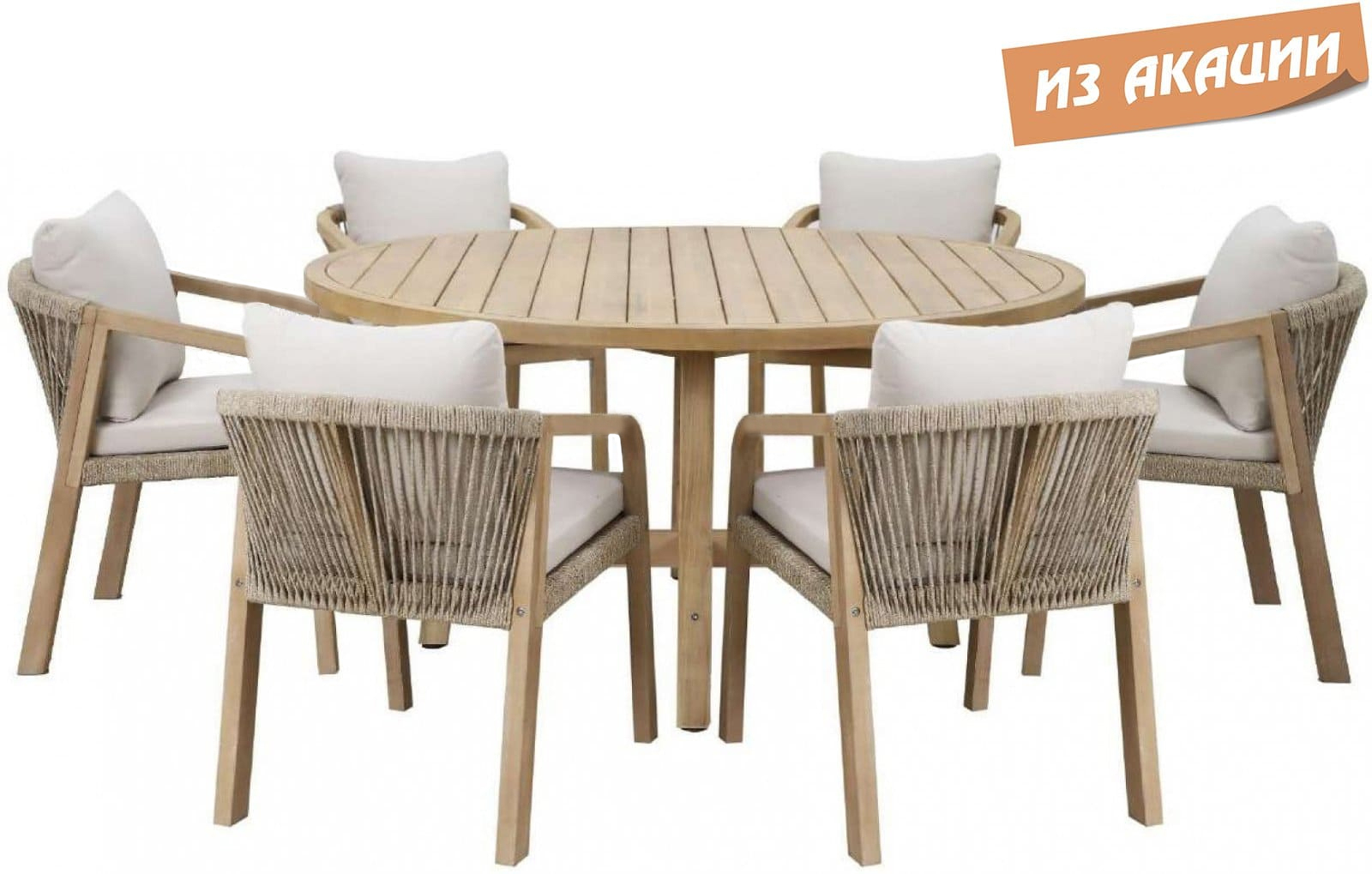 Обеденная группа Rimini, рассчитанная на 6 персон, - это садовая мебель из АКАЦИИ в современном стиле. Дизайнерские формы мебели из этой коллекции создадут стильный и узнаваемый облик зоны отдыха на вашей веранде. Rimini - это современная коллекция садовой мебели из акации, выполненная в комбинации натурального веревочного плетения роуп, акации и бежевых подушек. Цвет натуральной твердой древесины представляет собой натуральный цвет с мелкой текстурой, придающий древесине приятный теплый вид. Rimini - это стиль и элегантность на Вашей веранде.