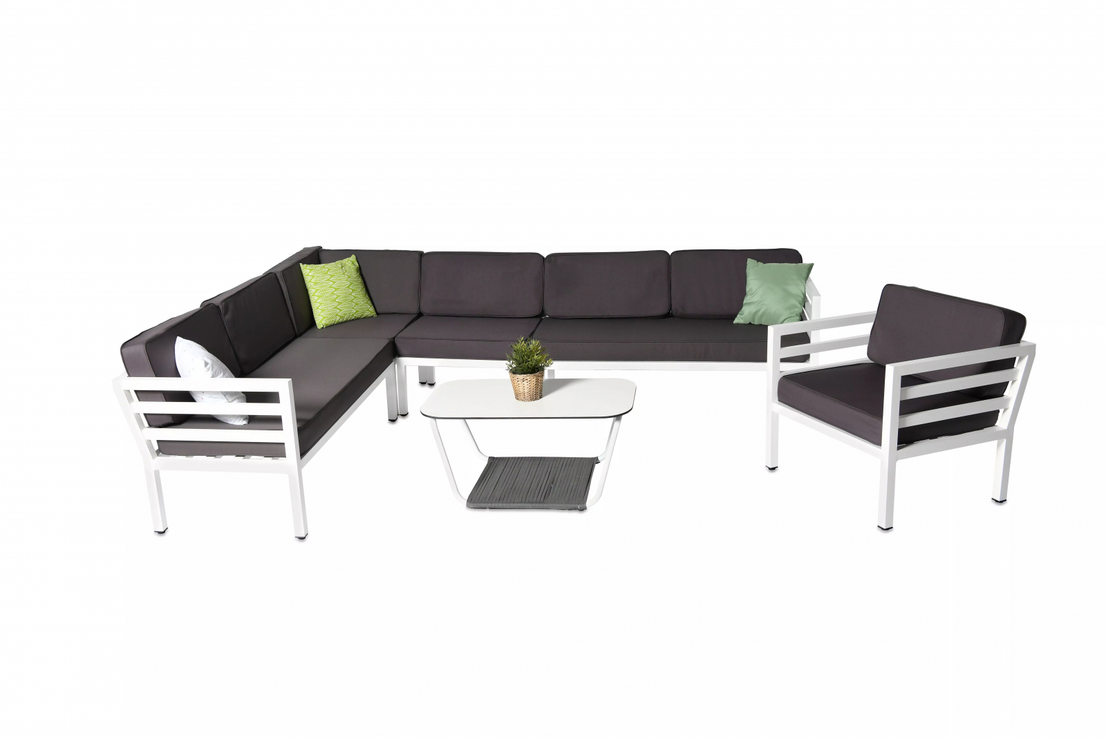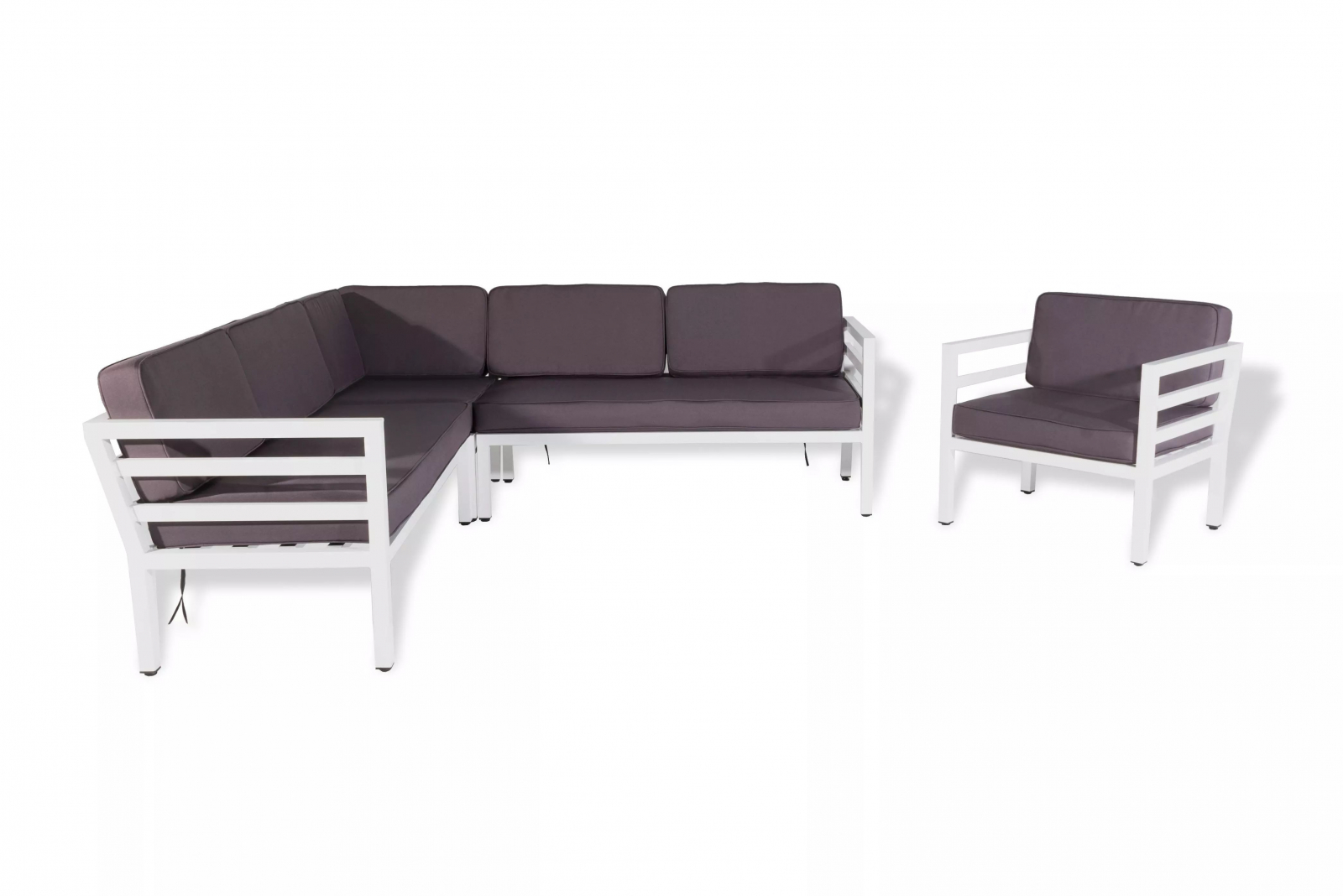 Угловой диванный модуль Глория выполнен из алюминия, легкого, но очень прочного материала. Каркас окрашен в белый цвет износостойкой порошковой краской. Дополняют модуль, как и полностью диван, подушки темно-серого цвета. Подходит для использования внутри помещения и на открытом воздухе.
