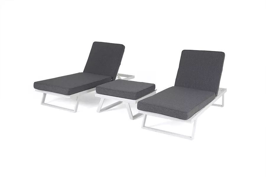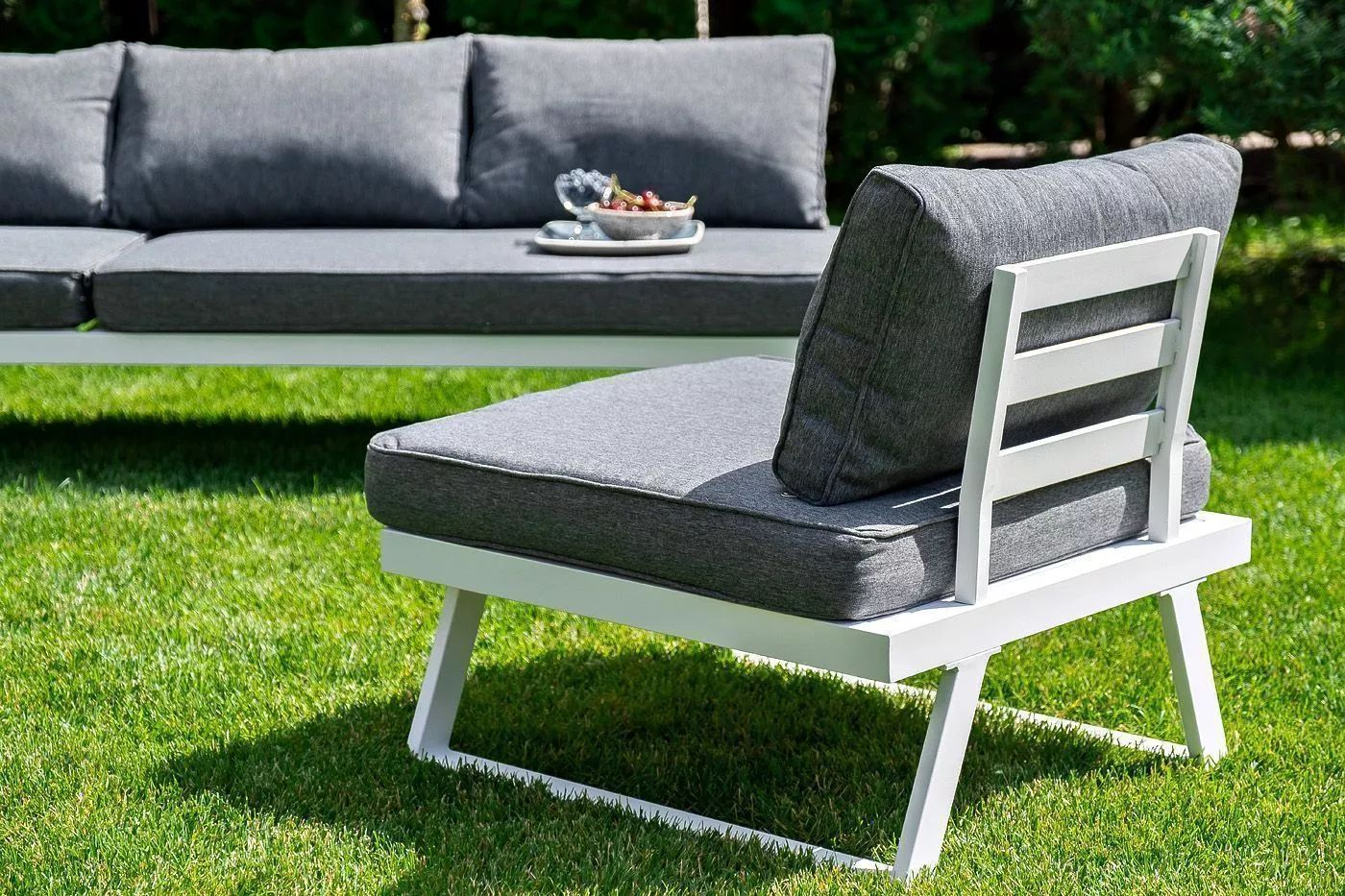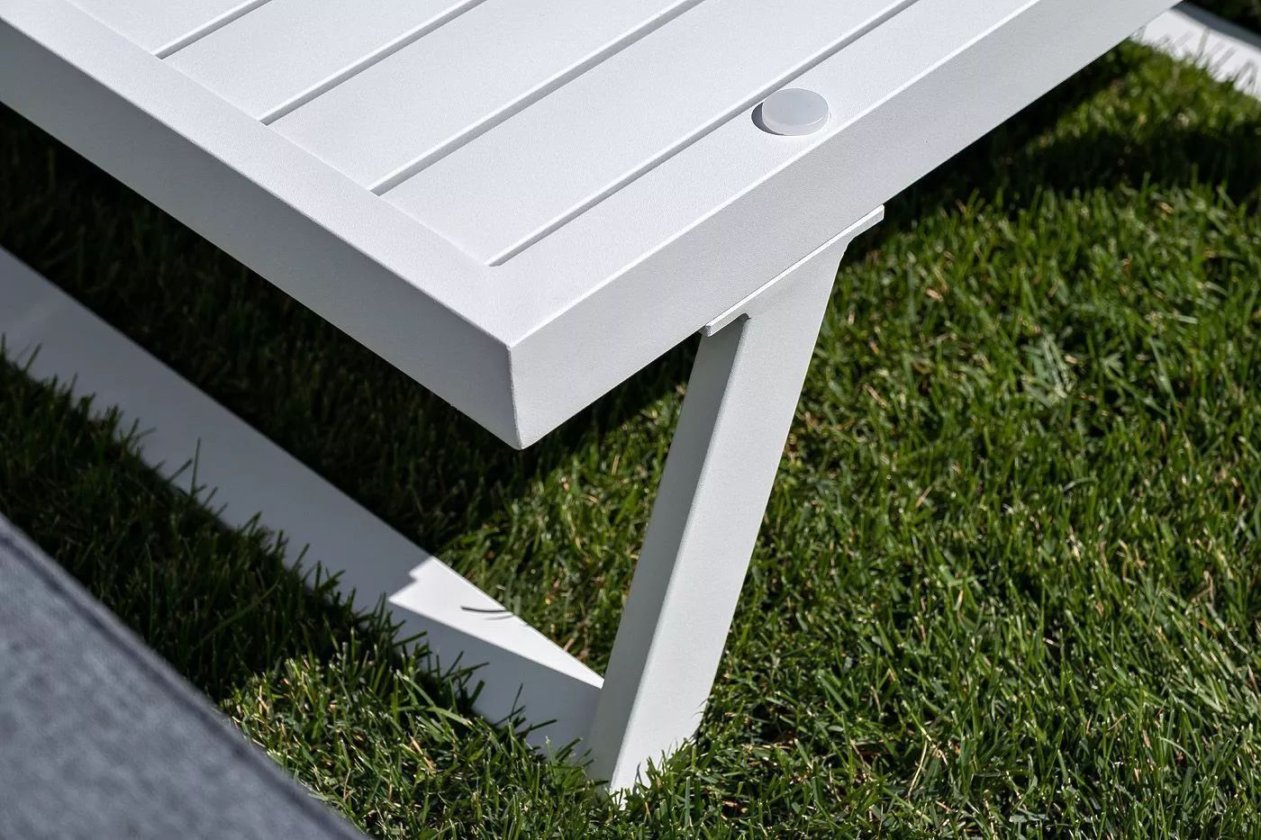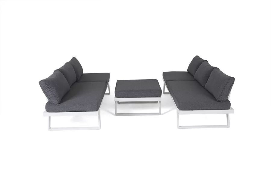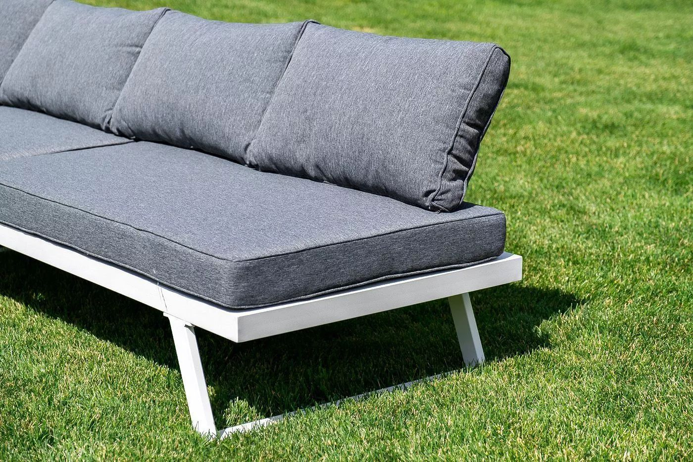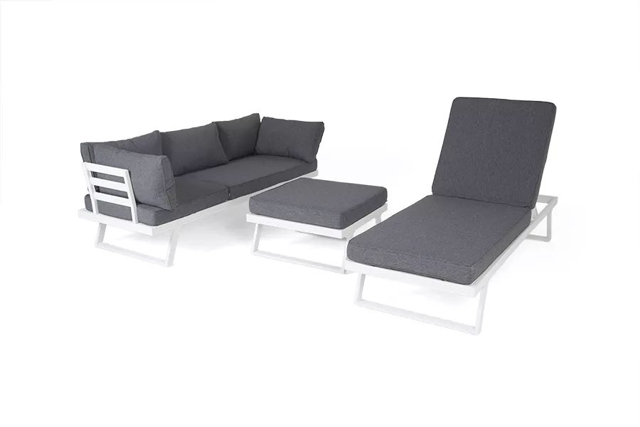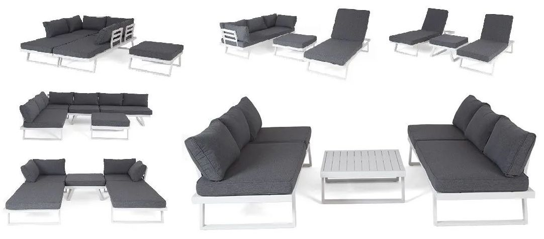Трансформирующаяся модульная лаунж-зона Альпы преобразовывается в 6 различных модификаций. Облегченный алюминиевый каркас, благодаря которому мебель долговечная и ее легко перемещать. Прямоугольные модули имеют возможность трансформироваться в шезлонги, а квадратный модуль может трансформироваться в три изделия (столик, оттоманка и кресло). Модули комплектуются мягкими подушками, которые обеспечивают максимальный комфорт.
