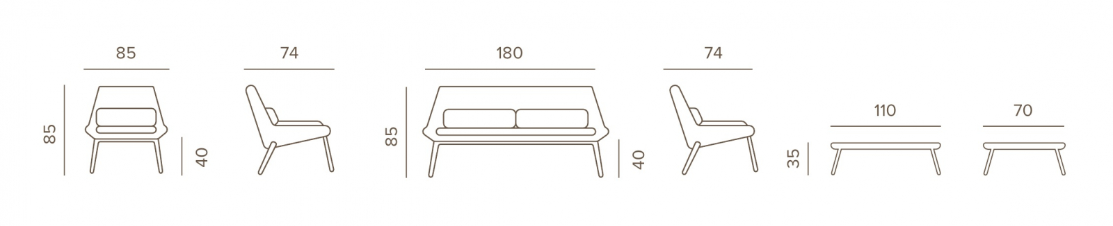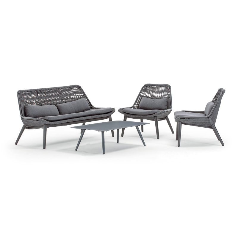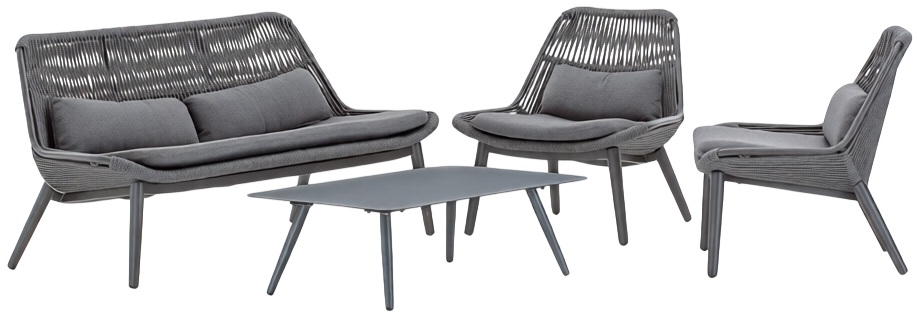 Комплект Como - это двухместный диван, два кресла и низкий столик из алюминия. Плетение дивана и кресел выполнено из акрилового каната Ø9 мм. Подушки на сиденьях и спинках выполнены из олефина - материала, устойчивого к пятнам и ультрафиолетовому излучению. Такой комплект будет уместен как в частных зонах отдыха, так и на террасах отелей, кафе и баров.