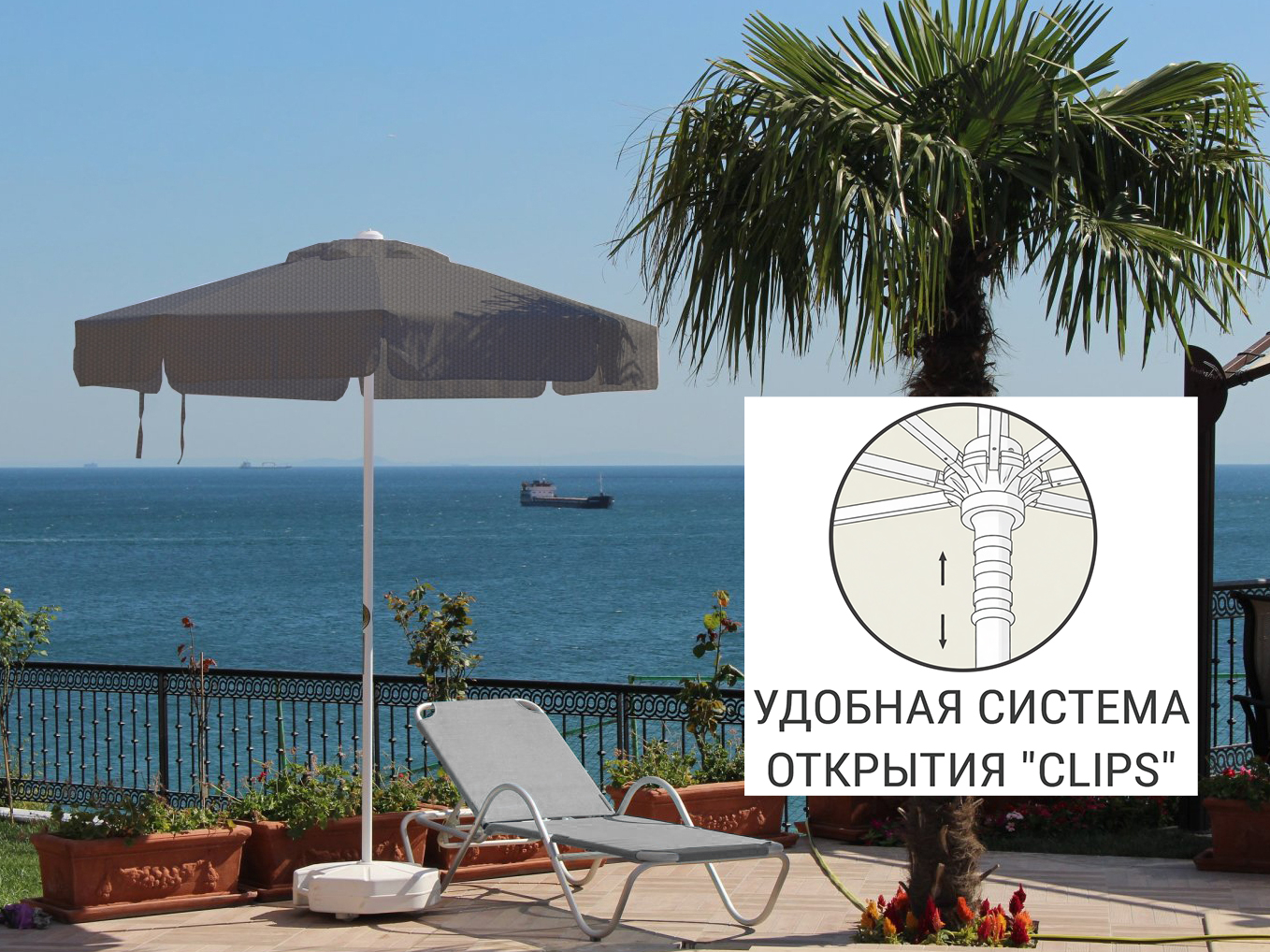 Kiwi Clips - профессиональный зонт с центральной опорой из алюминия, что обеспечивает высокую устойчивость модели. Он защитит от ярких солнечных лучей и создаст приятную затененную атмосферу в частных садах, открытых летних площадках кафе, баров и ресторанов, зоны возле бассейна.