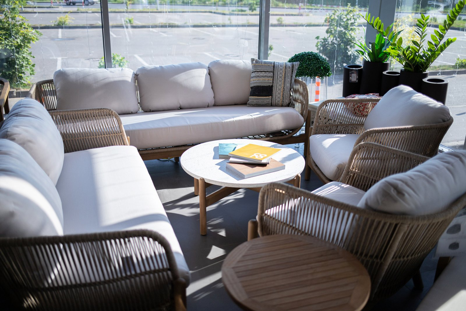 Крепкая алюминиевая рама оплетена синтетическим роупом. Обивка подушек выполнена из ткани олефин - прочного материала, устойчивого к воздействию грязи, влаги и УФ-лучей.