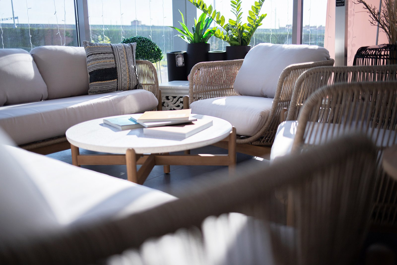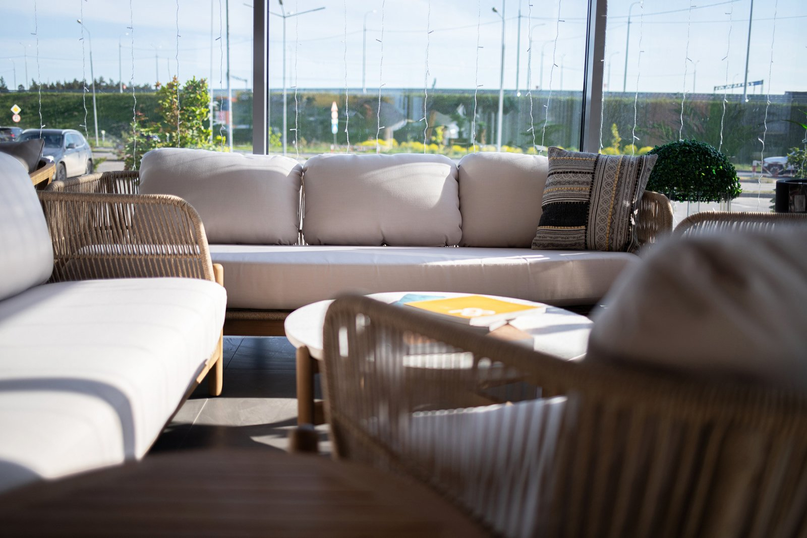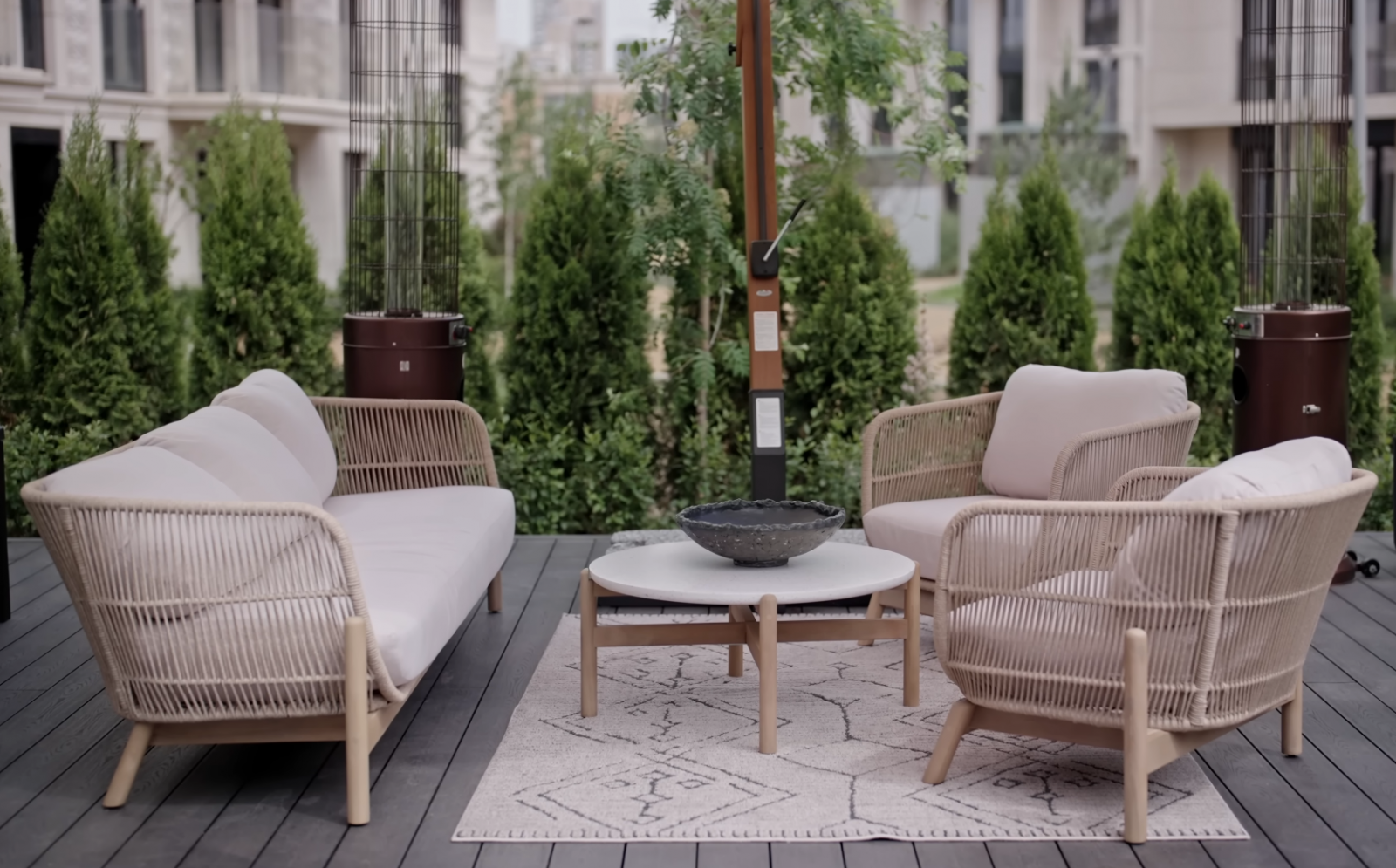Крепкая алюминиевая рама оплетена синтетическим роупом. Обивка подушек выполнена из ткани олефин - прочного материала, устойчивого к воздействию грязи, влаги и УФ-лучей.