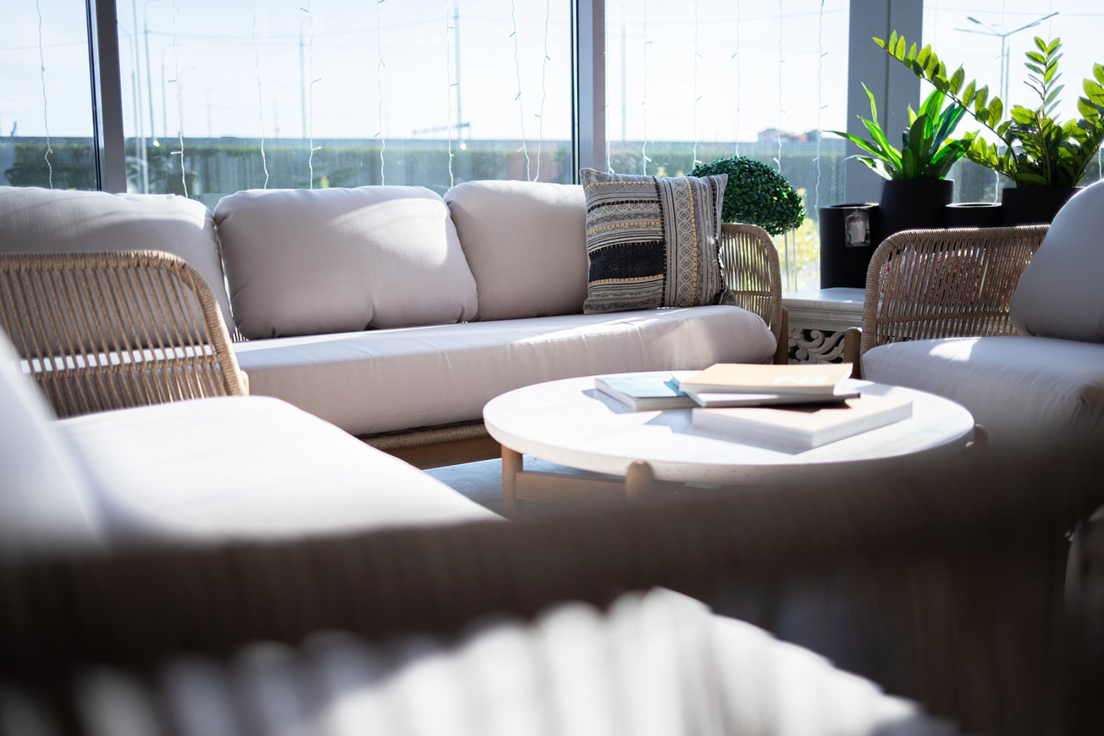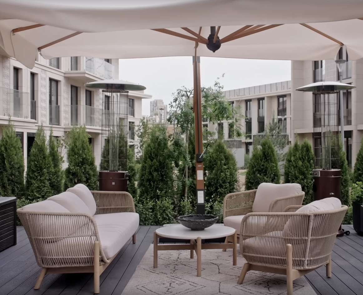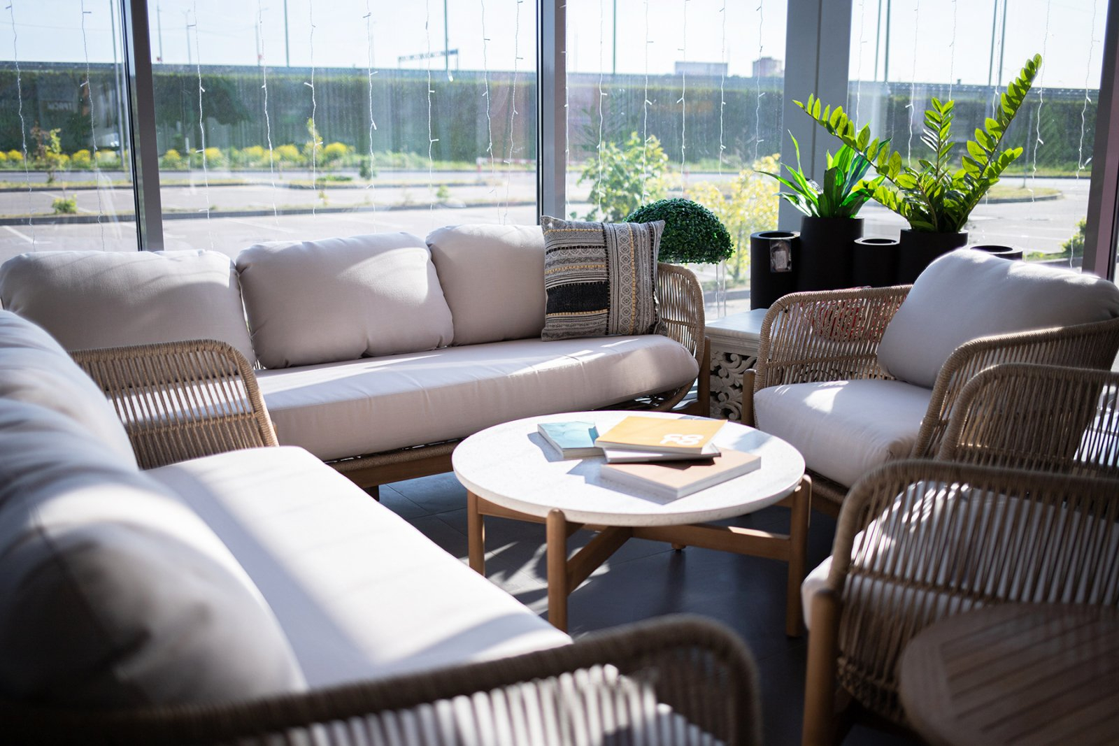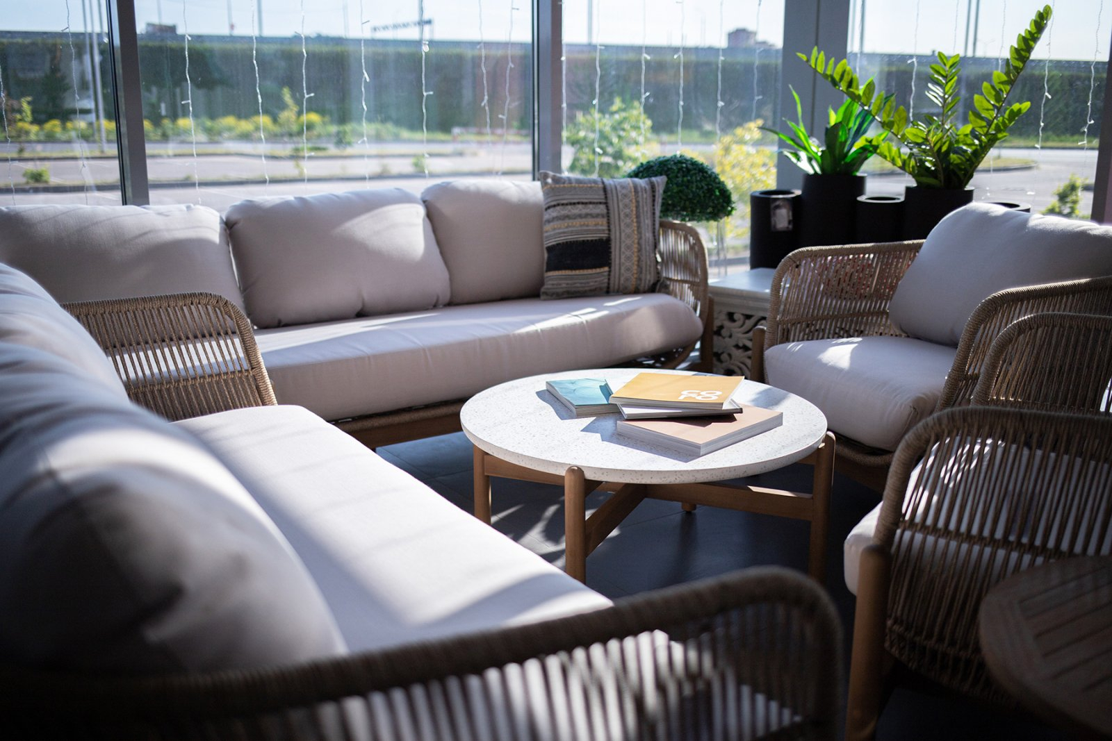 Крепкая алюминиевая рама оплетена синтетическим роупом. Обивка подушек выполнена из ткани олефин - прочного материала, устойчивого к воздействию грязи, влаги и УФ-лучей.