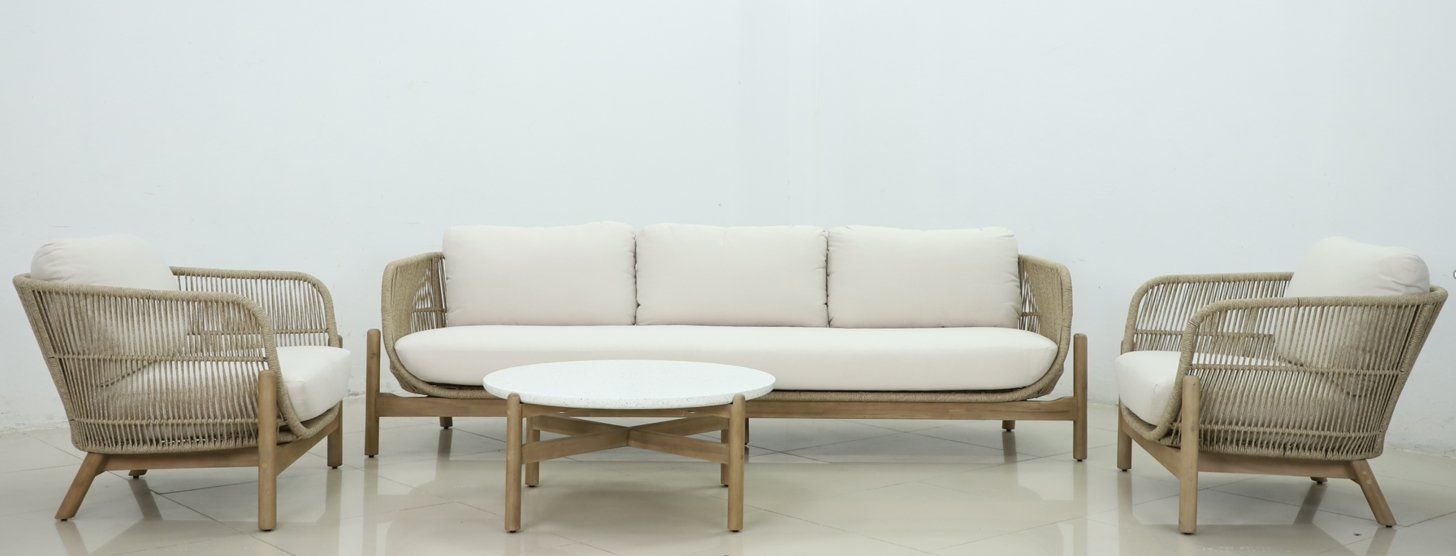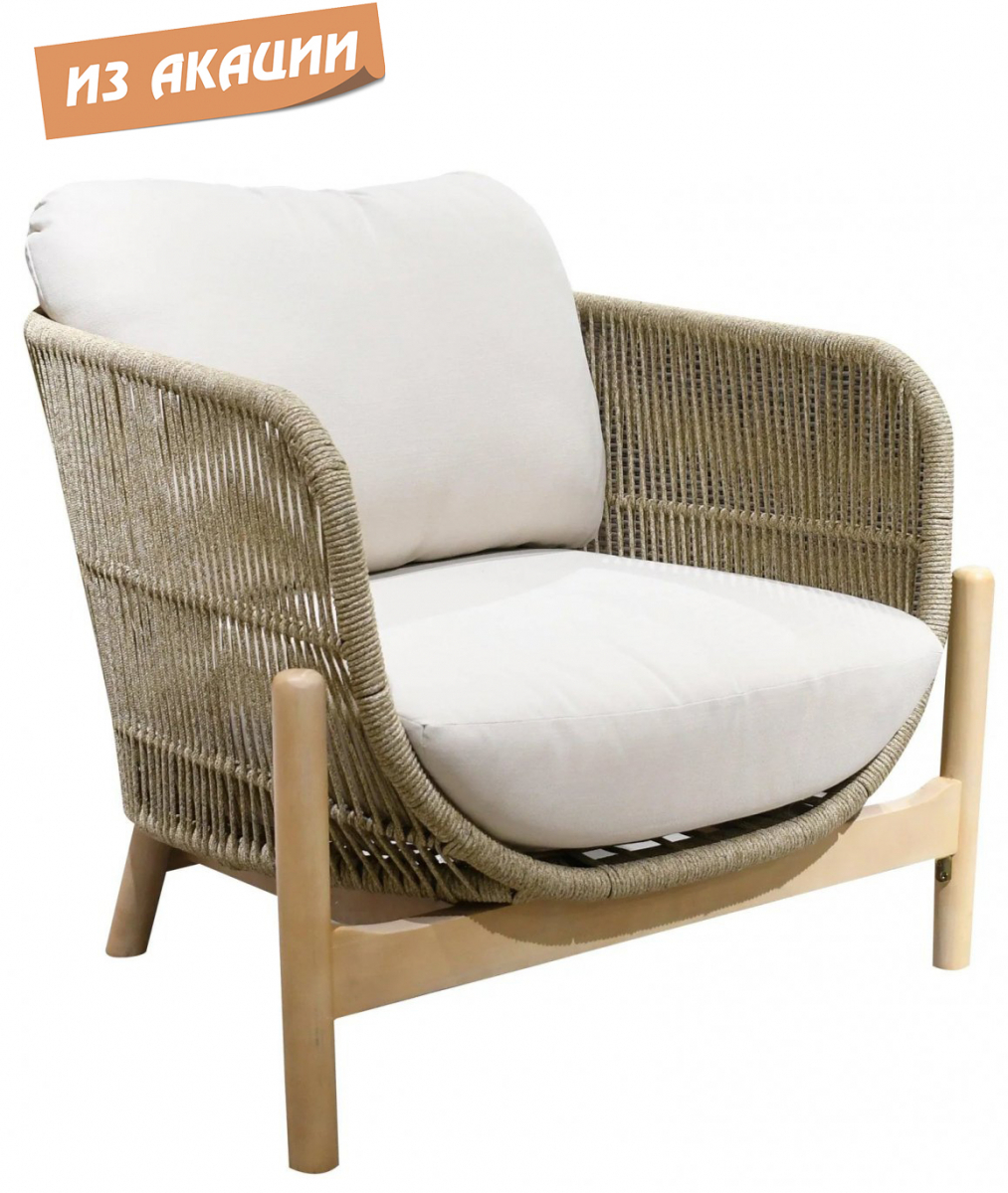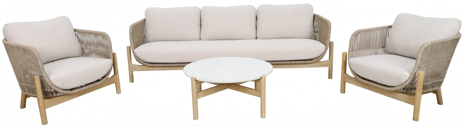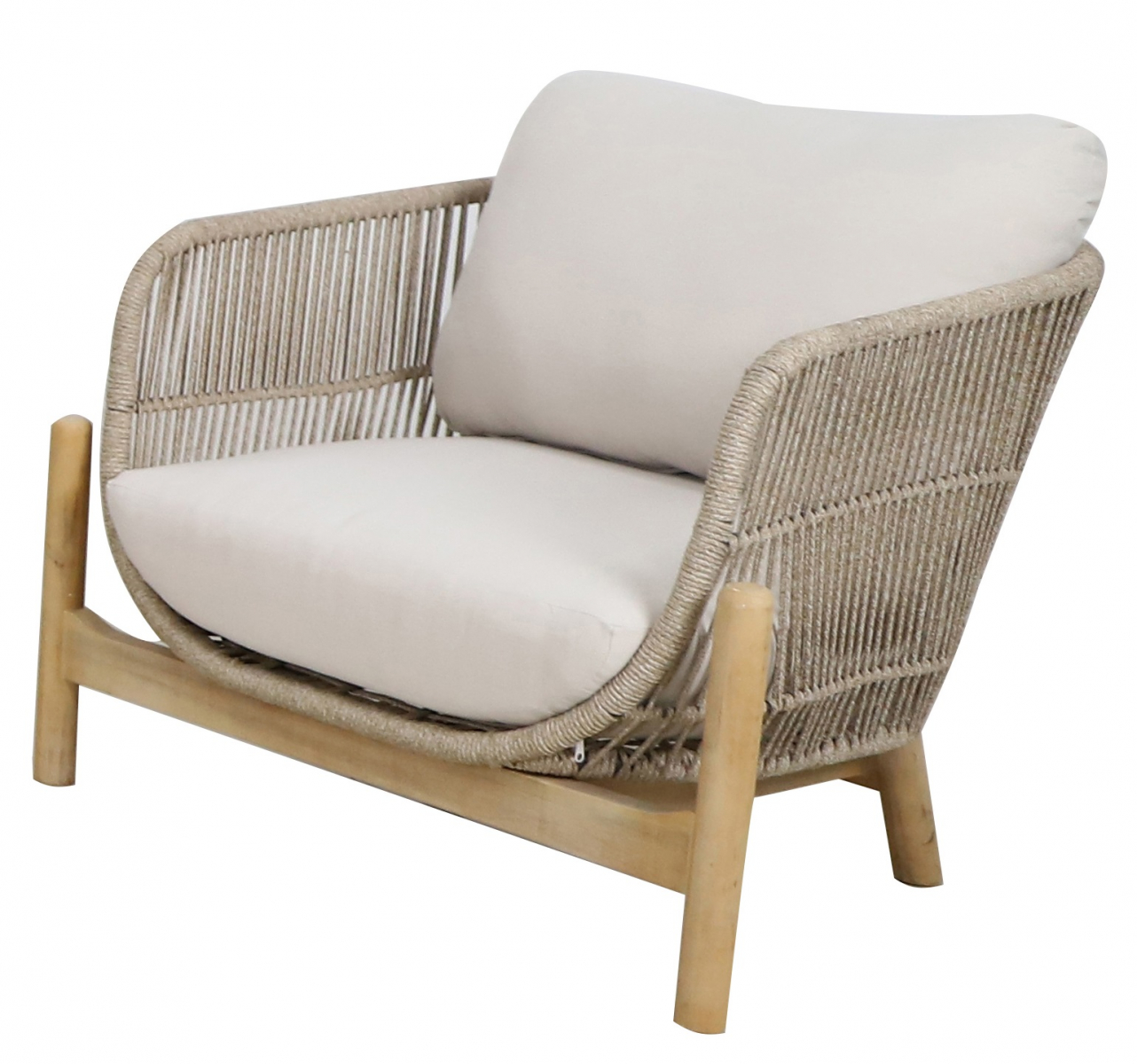 Talara - это современная коллекция садовой мебели из акации, выполненная в комбинации натурального веревочного плетения роуп, акации и светлых подушек. Цвет натуральной твердой древесины представляет собой натуральный цвет с мелкой текстурой, придающий древесине приятный теплый вид.