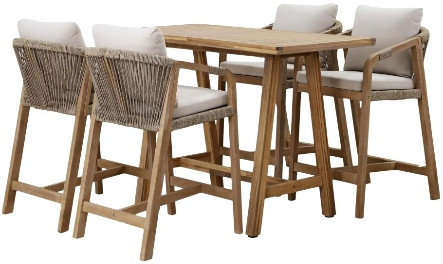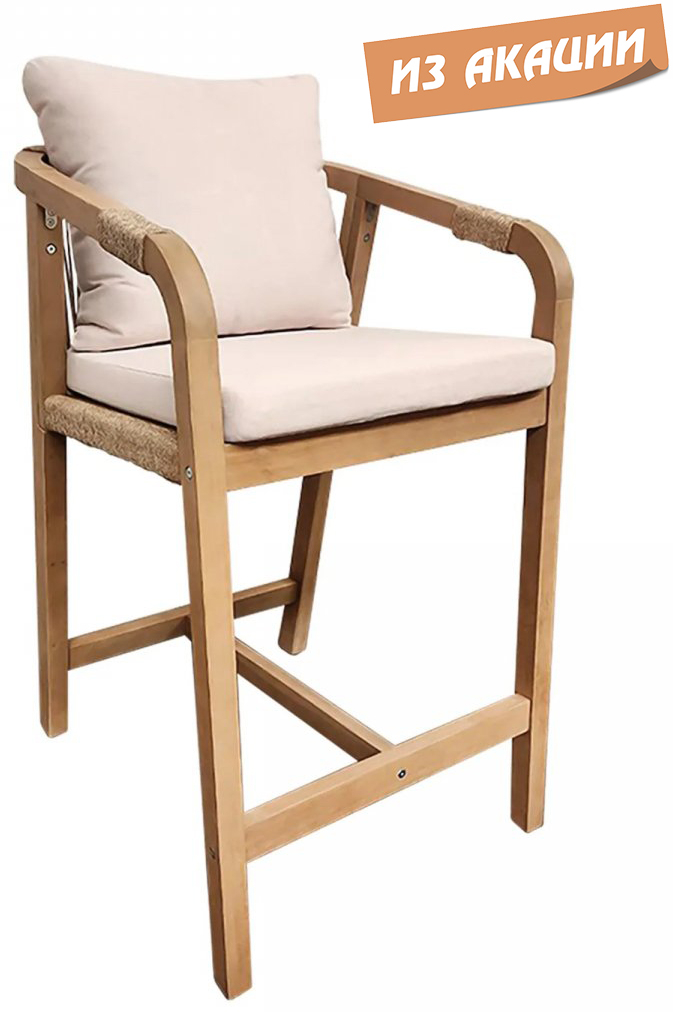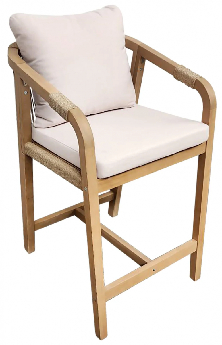 Барное кресло Rimini из АКАЦИИ в современном стиле. Дизайнерские формы мебели из этой коллекции создадут стильный и узнаваемый облик зоны отдыха на вашей веранде. Rimini - это современная коллекция садовой мебели, выполненная в комбинации натурального веревочного плетения роуп, акации и бежевых подушек. Цвет натуральной твердой древесины представляет собой натуральный цвет с мелкой текстурой, придающий древесине приятный теплый вид. Rimini - это стиль и элегантность на Вашей веранде.
