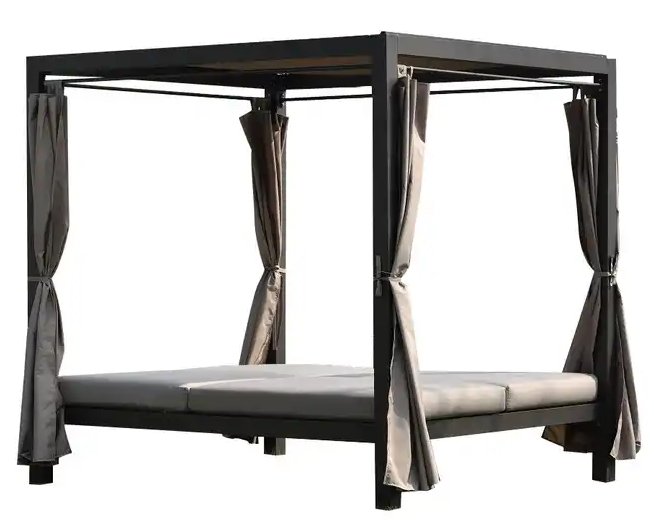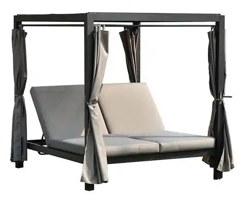 Крыша и боковые шторы выполнены из полиэстера и обеспечивают приятную тень от солнца и возможность создать атмосферу уединения.. Зона лежаков разделена на две части, спинки можно регулировать независимо друг от друга. Высота спинки регулируется в четырех положениях. Мягкие матрасы с чехлами из полиэстера обеспечивают настоящий комфорт.