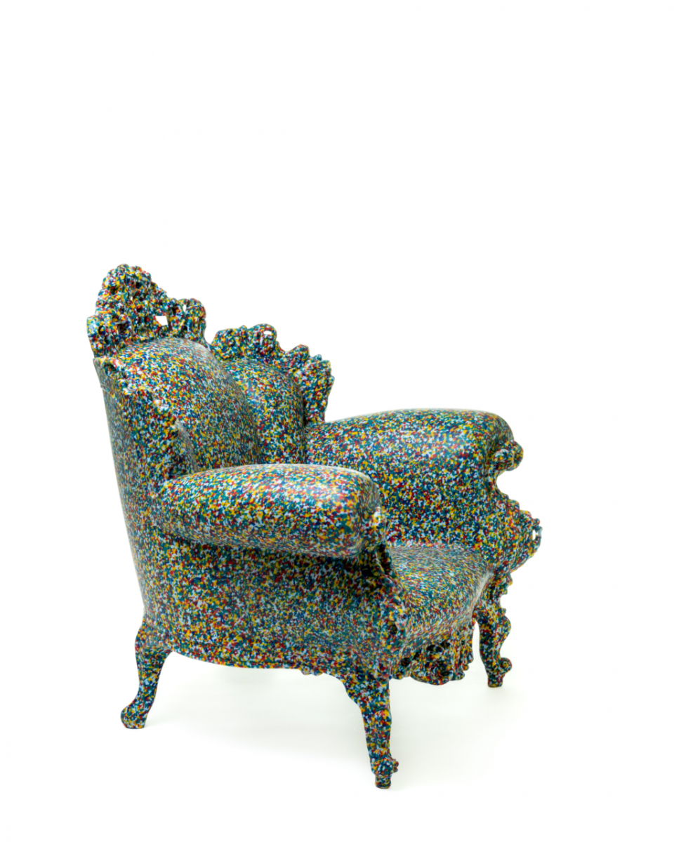 «Думаю, многие уже знают мое кресло Proust. Это романтическое кресло в стиле барокко, на котором вручную в технике пуантилизма нарисовано бесконечное количество разноцветных точек. Эти точки покрывают все кресло, как ткань, так и деревянные украшения. Это работа по перепроектированию. По сути, это сочетание псевдоантикварного кресла с деталью картины сада французского художника Синьяка. Начиная с 1978 года Proust выпускалось во многих вариантах, с использованием разных цветов, материалов и размеров, и даже было сделано из керамики и бронзы. Оно путешествовало по всему миру и было размещено во многих музеях.