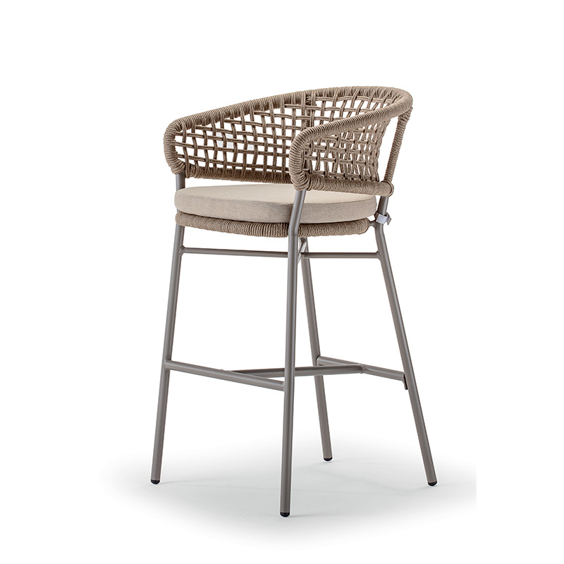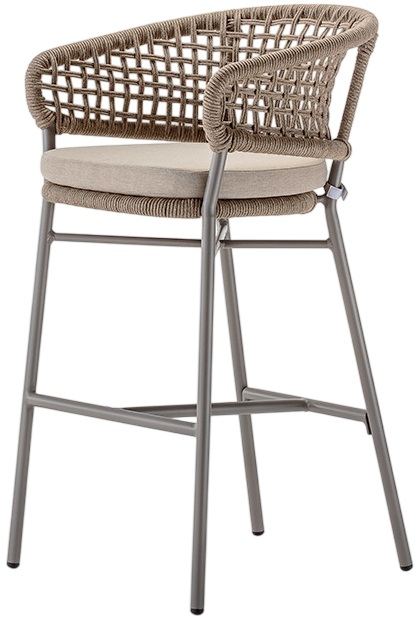 Барное кресло Atol имеет каркас из алюминия, оплетенный синтетическим канатом (роуп), и мягкую подушку на сиденье из олефина, устойчивого к пятнам и ультрафиолетовому излучению. Кресло с высоким сиденьем обеспечивает расслабление "на ходу" и подходит для оживленного образа жизни.