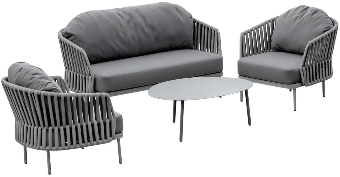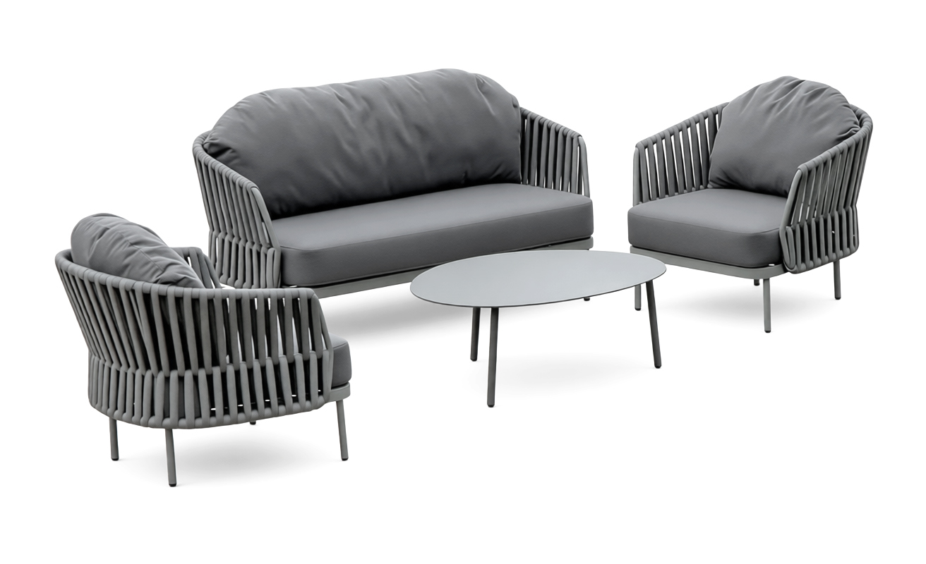 Уличный комплект Soho состоит из двухместного дивана, двух кресел и журнального столика со столешницей из алюминия. Алюминиевый каркас оплетен роупом (полиэстер и резина), мягкие подушки на сиденьях и спинках со съемными чехлами из олефина, устойчивого к загрязнениям и ультрафиолетовому излучению.