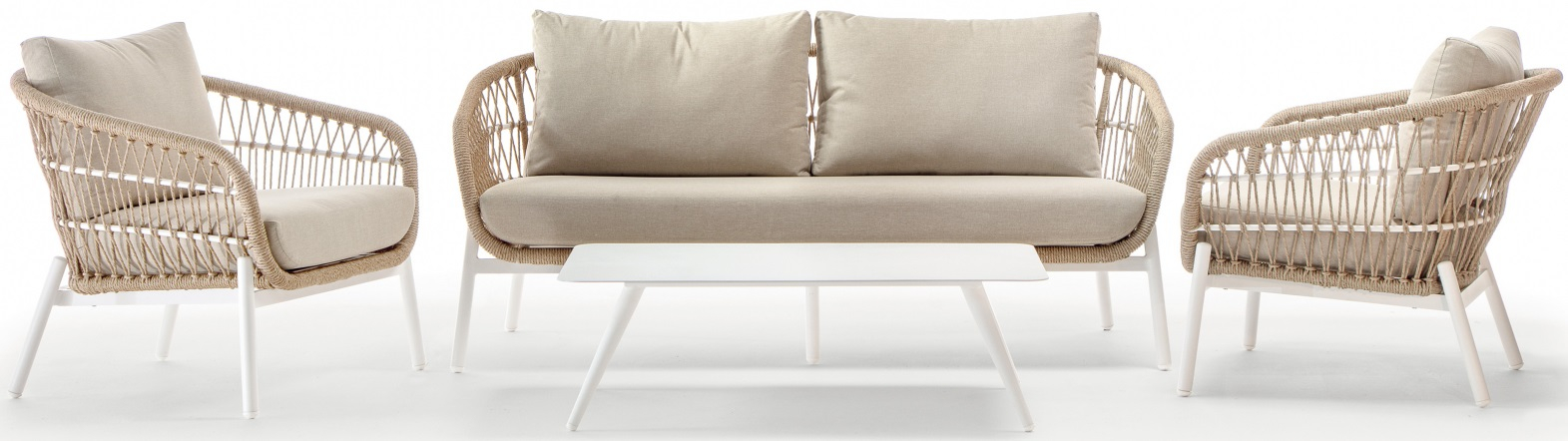 Уличный комплект Elba состоит из двухместного дивана, двух кресел и журнального столика со столешницей из алюминий. Алюминиевый каркас оплетен синтетическим роупом, мягкие подушки на сиденьях и спинках со съемными чехлами из олефина, устойчивого к загрязнениям и ультрафиолетовому излучению.