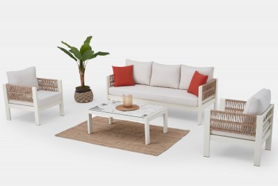 Комплект плетеной лаунж мебели Toscana – это идеальное решение для обустройства зоны отдыха как в сфере Contract, так и в частном проекте. Благодаря стильному внешнему виду и своим характеристикам комплект можно легко использовать в саду, на балконе или террасе. Благодаря алюминиевому каркасу мебель обладает прочностью и надежностью, а за счет плетения из акрила ее можно использовать на открытых пространствах, не боясь потери привлекательного внешнего вида, и с гарантированным сохранением цвета. Подушки на сиденьях дивана и кресел обеспечивают очень комфортную и удобную посадку.
