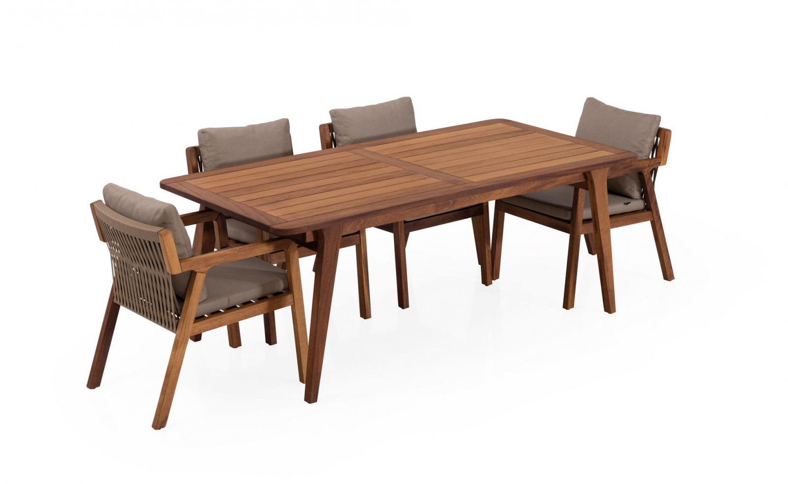 Комплект мебели Idea отличается своей долговечностью, устойчивостью к сезонным изменениям, солнечному свету и другим внешним факторам и представляет собой долгосрочную инвестицию. Использование эксклюзивных материалов, таких как дерево ироко, тщательное мастерство плетения из роупа ручной работы и особые свойства тканей для уличного использования - все это украсит Ваше жилое пространство и позволит максимально насладиться отдыхом на свежем воздухе.
