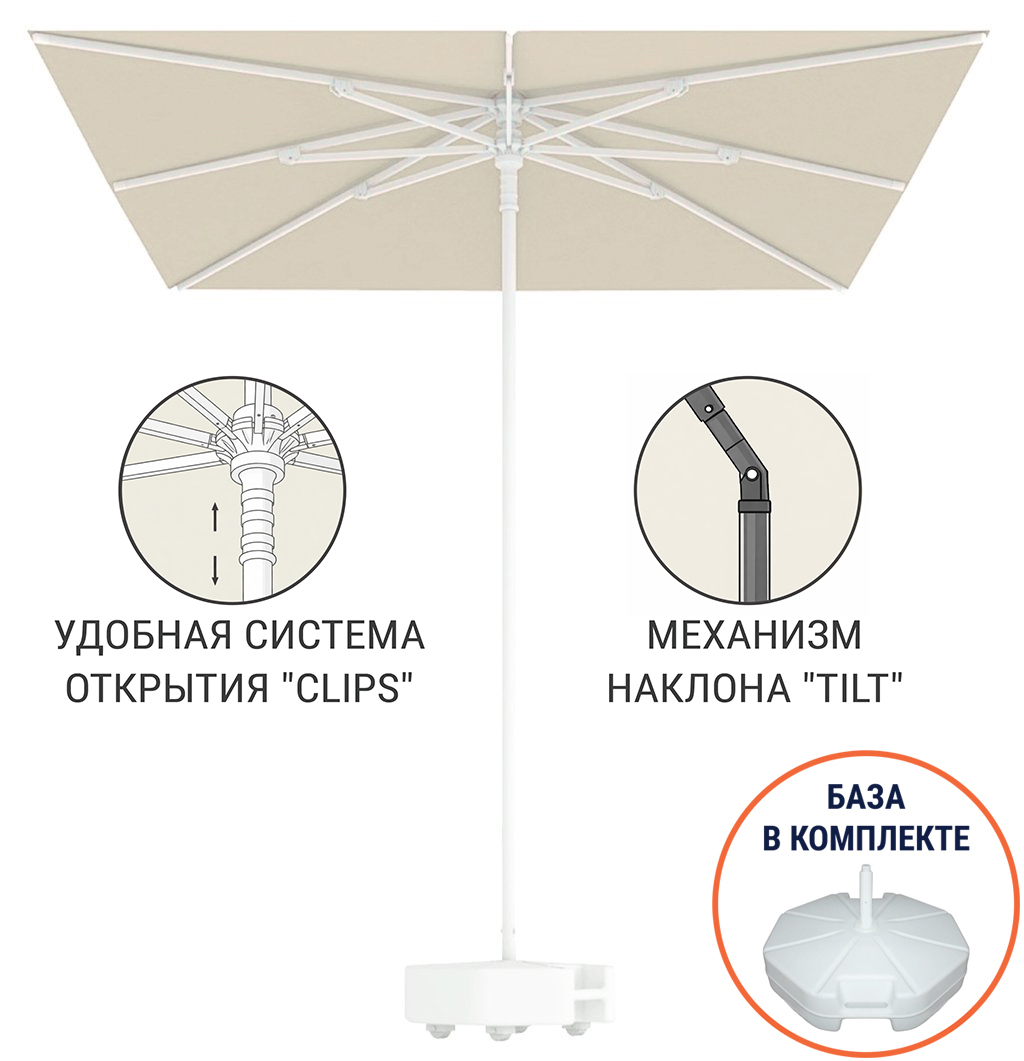 Kiwi Clips - профессиональный зонт с центральной опорой из алюминия, что обеспечивает высокую устойчивость модели. Он защитит от ярких солнечных лучей и создаст приятную затененную атмосферу в частных садах, открытых летних площадках кафе, баров и ресторанов, зоны возле бассейна.