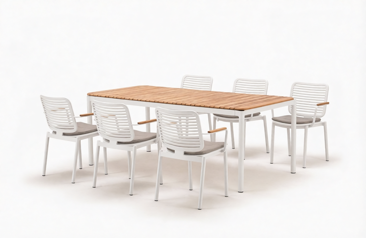 Обеденная группа Armona, рассчитанная на 6 персон, состоит из металлического стола с красивой реечной деревянной столешницей и кресел с мягкими подушками. Мебель Armona создана, чтобы выдержать испытание временем. Рама изделий изготовлена из алюминия с порошковым покрытием, что обеспечивает долговечность. Штабелируемые кресла оснащены элегантными подлокотниками из тикового дерева и съемными подушками, что делает их невосприимчивыми к различным погодным условиям.