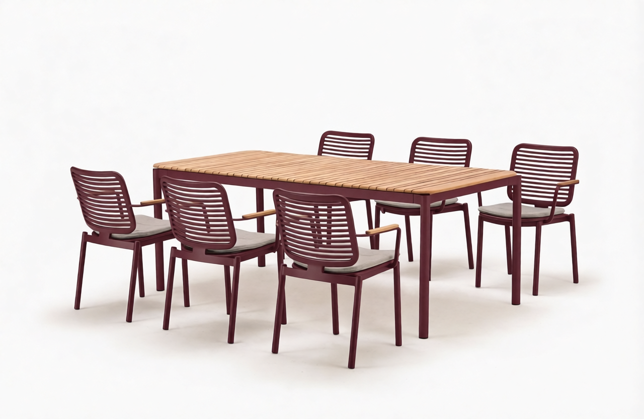 Обеденная группа Armona, рассчитанная на 6 персон, состоит из металлического стола с красивой реечной деревянной столешницей и кресел с мягкими подушками. Мебель Armona создана, чтобы выдержать испытание временем. Рама изделий изготовлена из алюминия с порошковым покрытием, что обеспечивает долговечность. Штабелируемые кресла оснащены элегантными подлокотниками из тикового дерева и съемными подушками, что делает их невосприимчивыми к различным погодным условиям.
