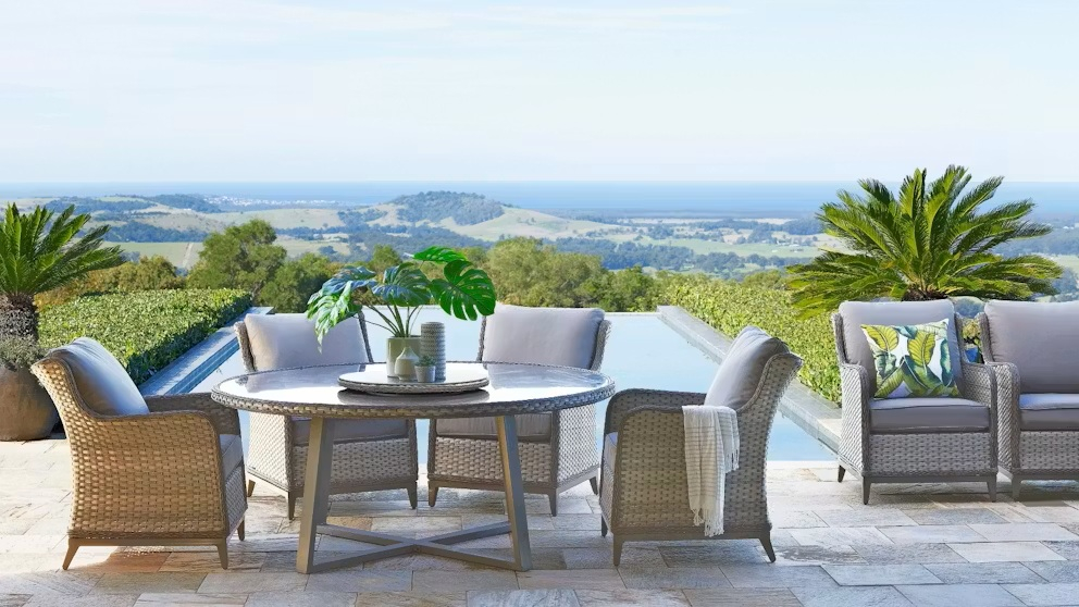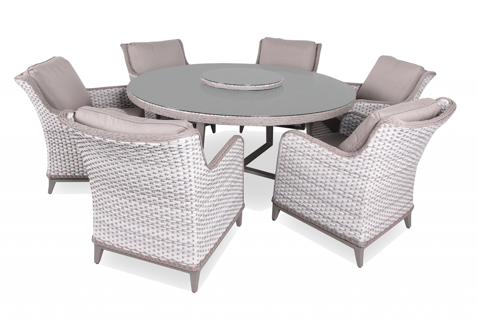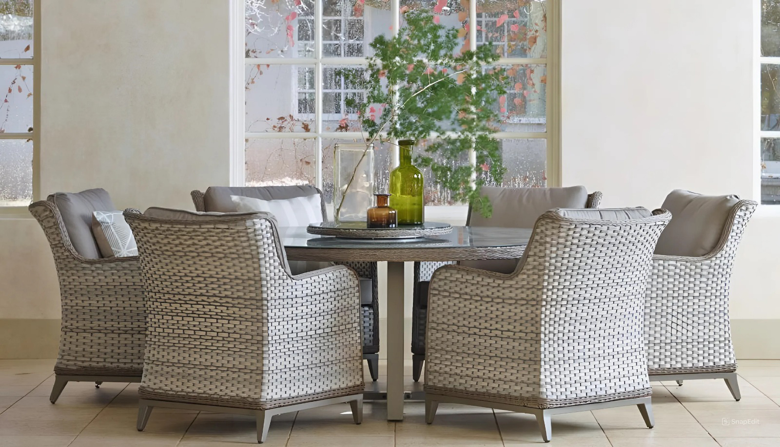 Ансамбль с обеденным столом с оригинальной столешницей и мягкими креслами с плетением из искусственного ротанга, создан для незабываемых моментов на свежем воздухе.