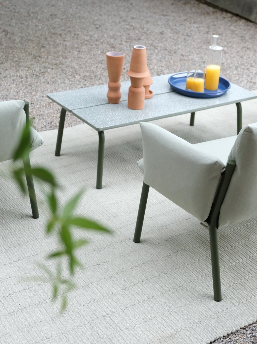 Для обеспечения большей адаптации к особенностям любого пространства и облегчения конфигурации мест отдыха на открытом воздухе коллекция Brezza включила в себя низкий кофейный столик, характеризующийся двумя большими планками, доступный в версии со столешницей из бетона или HPL.