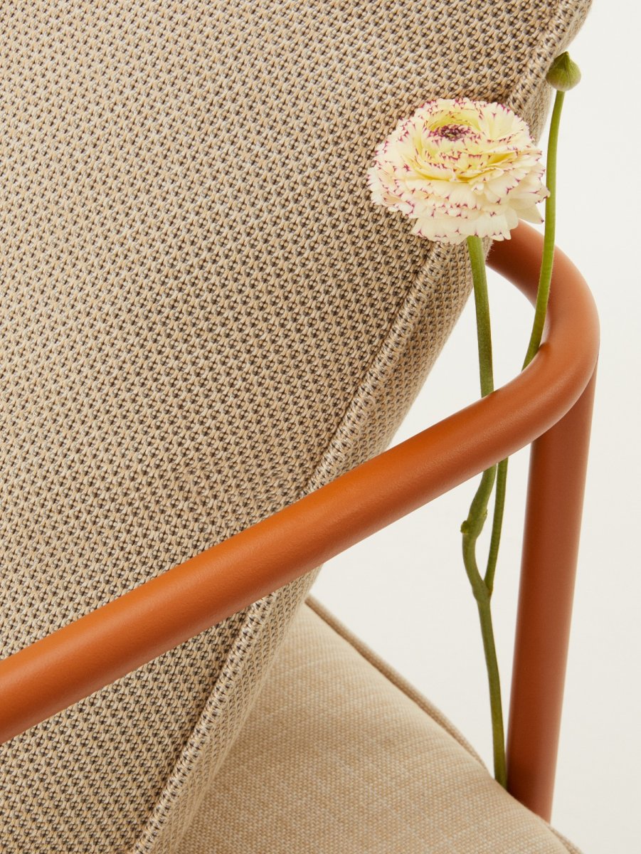 Цена на сайте указана за модель с каркасом терракотового цвета и обивкой кремового цвета (сиденье из ткани Agora, спинка из ткани Acrylic). Для уточнения всех возможных вариантов материала и цвета данного изделия обращайтесь к нашим менеджерам.