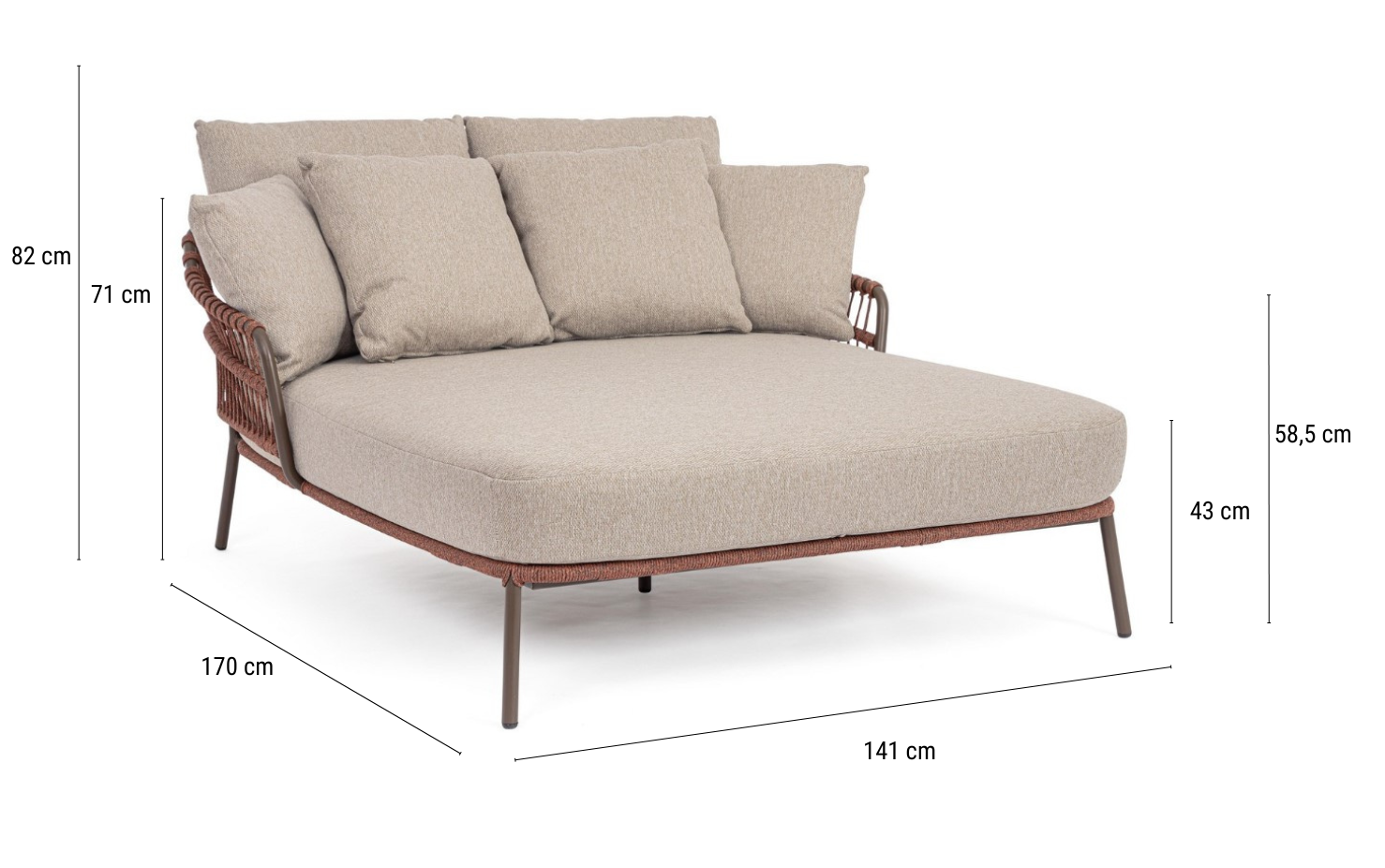 Лаунж-лежак Talaia - это современный предмет мебели интересной формы и цвета, благодаря которому он оживит любое пространство, в котором находится. Лежак привлекает внимание и станет прекрасным дополнением гостиной зоны на открытом пространстве. Он изготовлен из стали и имеет мягкие подушки на сиденье и спинке. Подлокотники и продуманная конструкция гарантируют комфорт во время использования. Плетеный корпус придает лежаку удивительный характер. Ножки обеспечивают хорошую устойчивость.