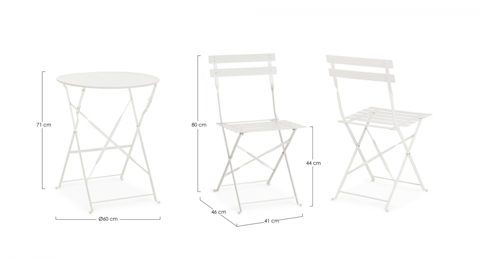 Набор состоит из стола и двух стульев. Мебель полностью сделана из стали порошковым покрытием (полиэстер) для наружного использования (e-coating) с матовой отделкой.
