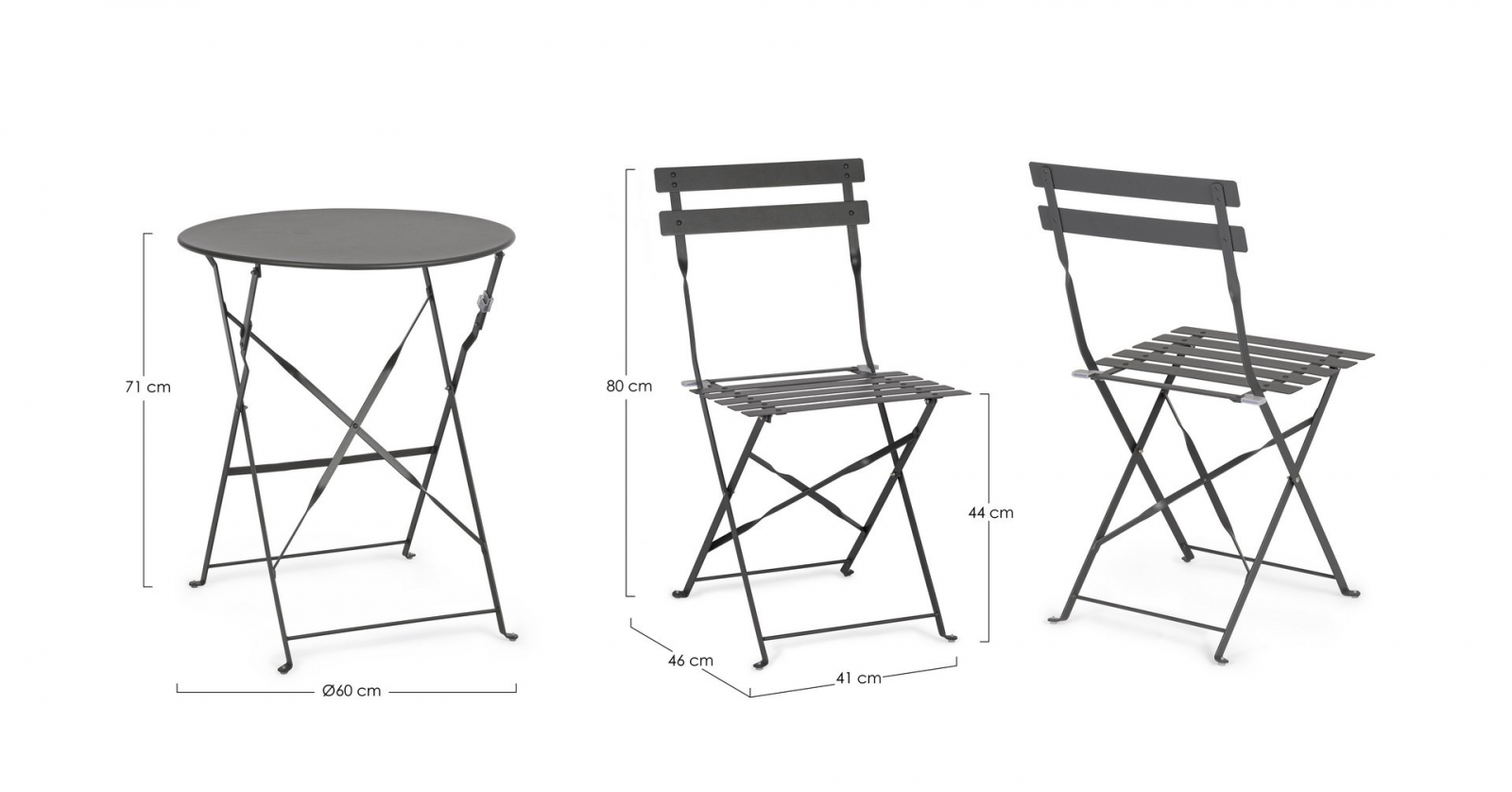 Набор состоит из стола и двух стульев. Мебель полностью сделана из стали порошковым покрытием (полиэстер) для наружного использования (e-coating) с матовой отделкой.
