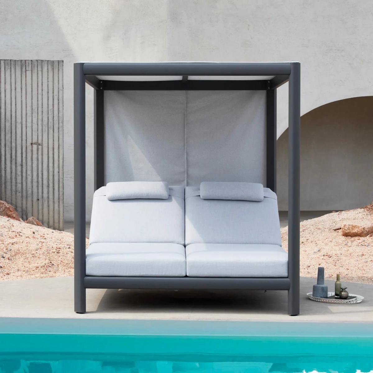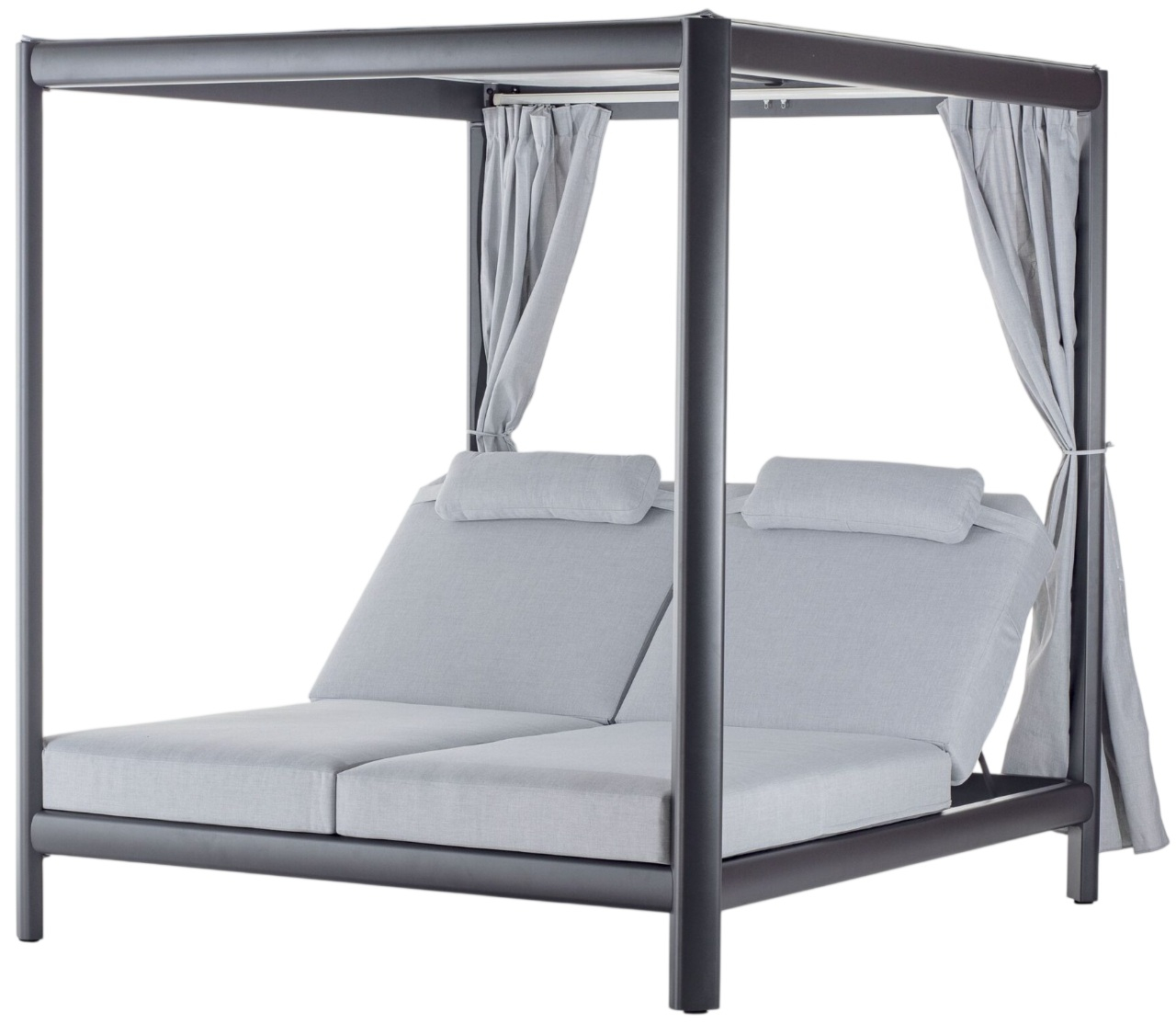 Шатер с лежаками Doha - это максимальный комфорт и современный дизайн для эксклюзивных пространств на открытом воздухе. Прочная алюминиевая рама антрацитового цвета обеспечивает долговечность и изысканный вид шатра. Просторные откидывающиеся лежаки обтянуты водоотталкивающей олефиновой тканью и оснащены регулируемыми спинками в 5 положениях для индивидуального комфорта. Встроенные шторы обеспечивают дополнительную конфиденциальность и тень.