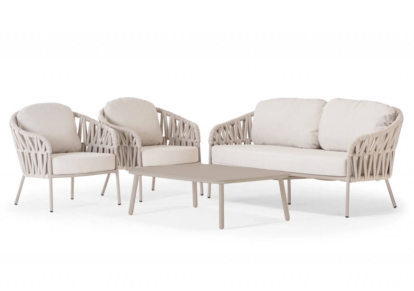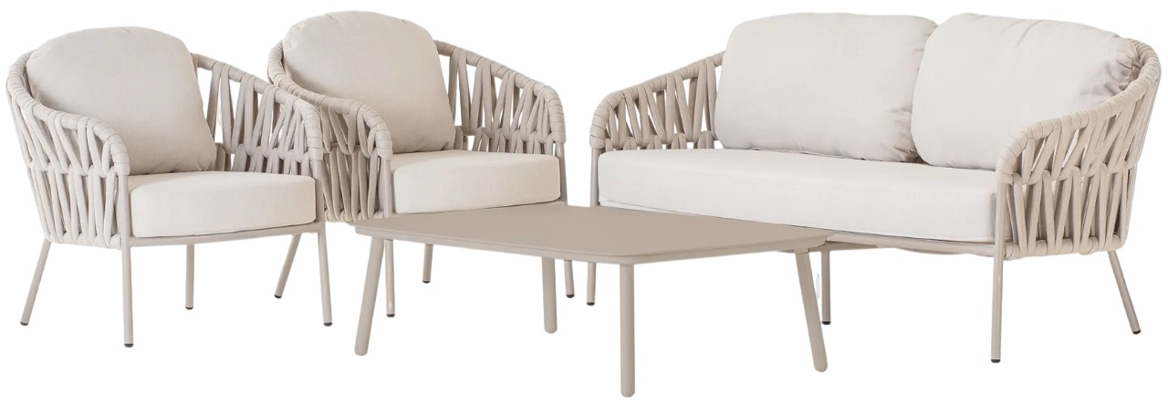 Садовый комплект мебели Victory - это идеальное сочетание современного дизайна, высокого качества изготовления и максимального комфорта. Этот комплект, состоящий из просторного дивана, двух удобных кресел и стильного журнального столика с алюминиевой столешницей, станет роскошным решением для отдыха на открытом воздухе: на террасе, в саду или в гостиной. Прочный алюминиевый каркас обтянут полиэстером и резиновым канатом, а съёмные подушки из олефина с водоотталкивающей пропиткой обеспечат максимальный комфорт.