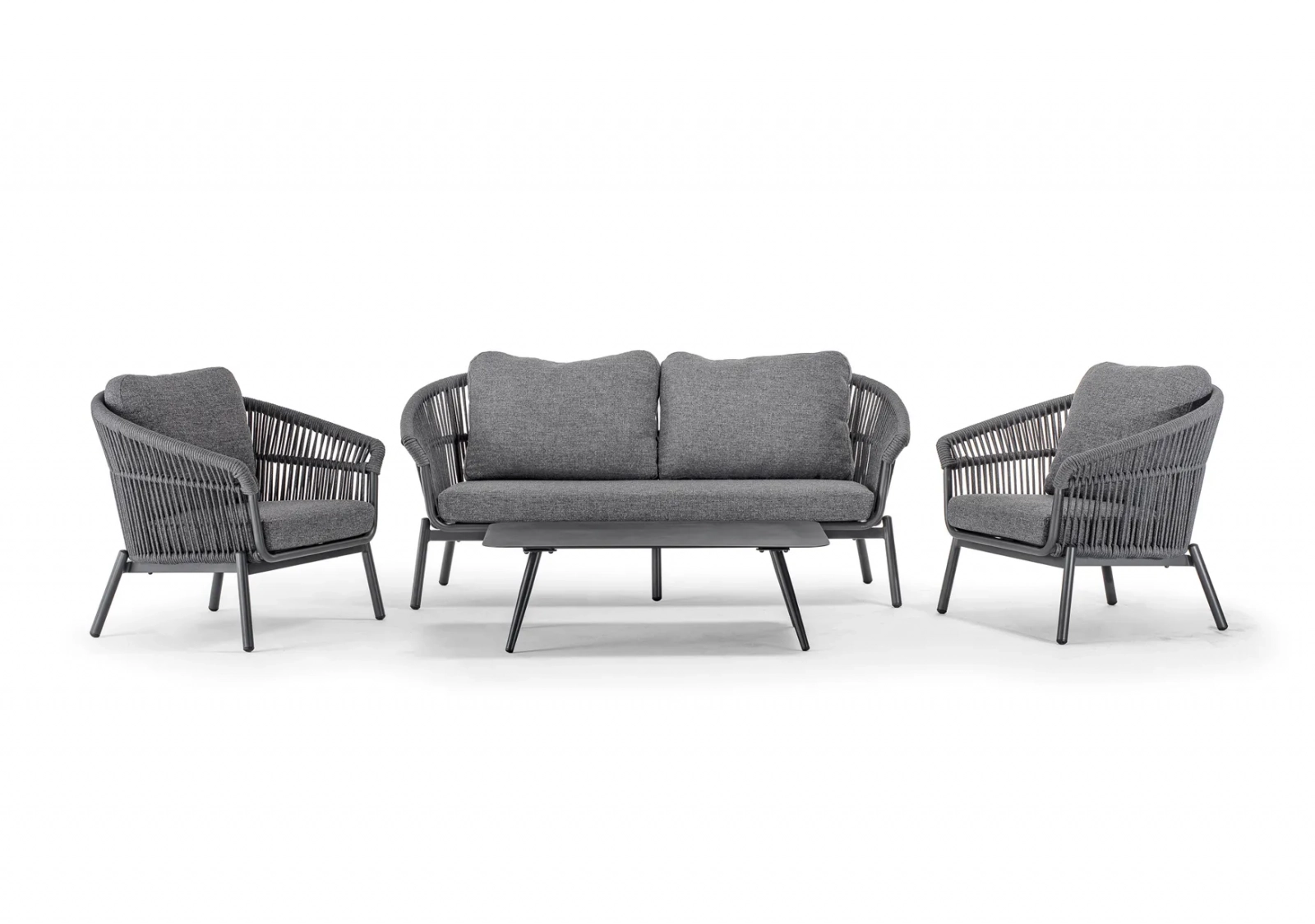 Садовый комплект для отдыха Tropea сочетает в себе современный дизайн, высокий комфорт и долговечность материалов. Он состоит из двух кресел, двухместного дивана и журнального столика с алюминиевой столешницей и идеально подходит для стильных открытых пространств. Алюминиевый каркас обтянут текстильным канатом толщиной 8 мм, а подушки из олефина с быстросохнущим пеноматериалом обеспечивают максимальный комфорт.