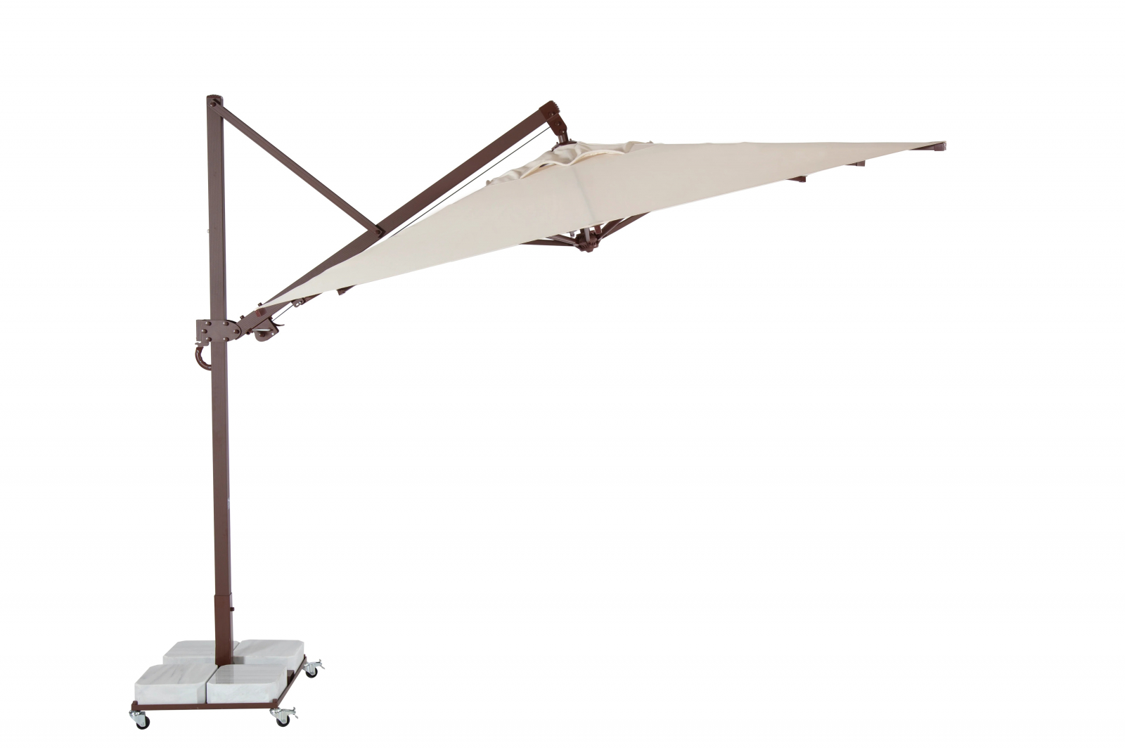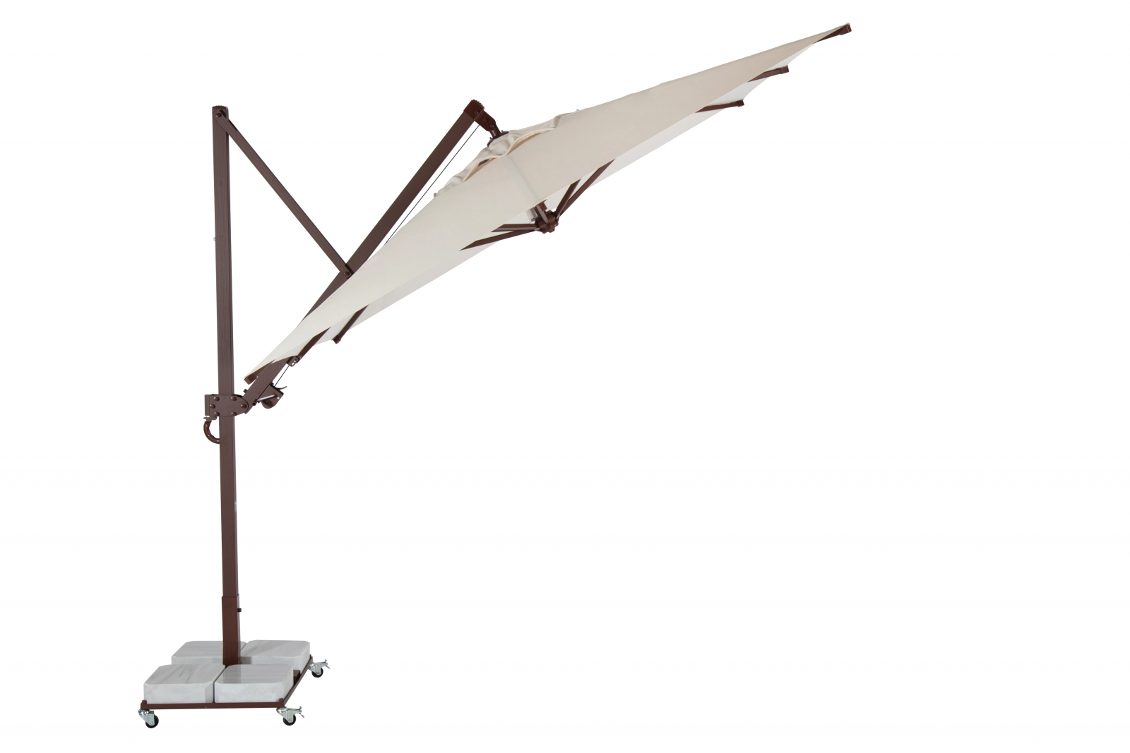 Зонт легко открывается и закрывается при помощи рукоятки, а сам механизм блокируется для безопасности. Купол может подниматься под углом до 60°. Для того, чтобы закрыть или открыть зонт Banana Plus, не нужно двигать мебель под ним.