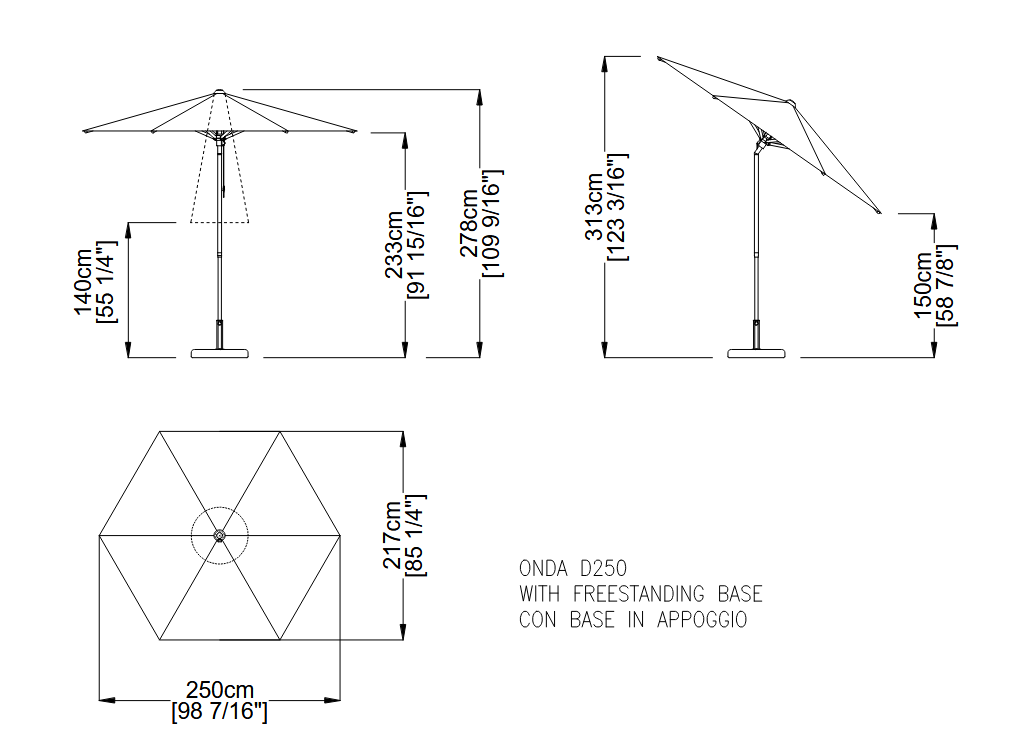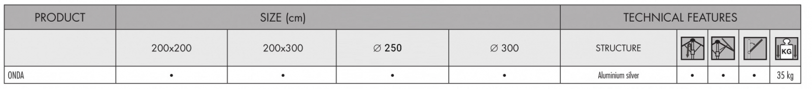 Уникальный наклон и прочные материалы делают зонт Onda идеальным продуктом для садов и частных террас. Алюминиевый каркас с дубовой верхушкой и простым механизмом открытия. Спицы могут быть заменены по отдельности без необходимости разборки всей конструкции, а ткань навеса легко снимается для обслуживания или замены. Опора, состоящая из двух частей, легко разбирается, и оснащена стальной арматурой. Все продукты FIM разработаны и изготовлены в Италии с использованием лучших материалов для наружного применения, чтобы гарантировать исключительную долговечность даже в самых жестких условиях окружающей среды.