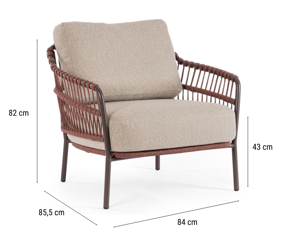 Лаунж кресло Talaia - это современный предмет мебели интересной формы и цвета, благодаря которому он оживит любое пространство, в котором находится. Кресло привлекает внимание и станет прекрасным дополнением гостиной зоны на открытом пространстве. Оно изготовлено из стали и имеет мягкие подушки на сиденье и спинке. Подлокотники и продуманная конструкция гарантируют комфорт во время использования. Плетеный корпус придает креслу удивительный характер. Ножки обеспечивают хорошую устойчивость.