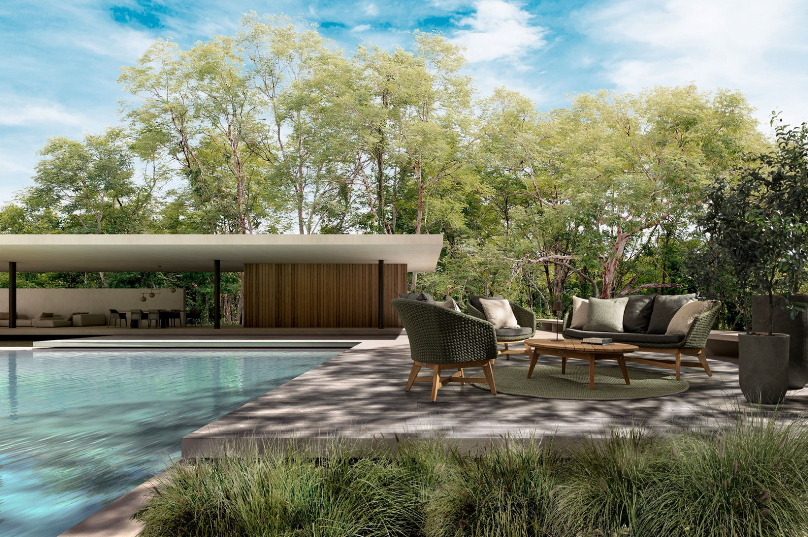 Кофейный столик Coachella создает комфортную лаунж зону с креслами и диваном коллекции.